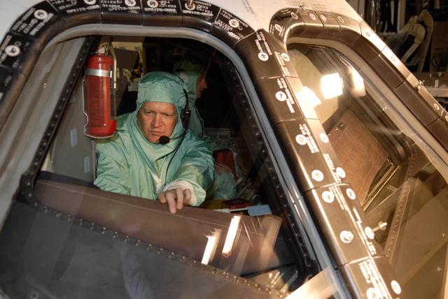 CAPE CANAVERAL, Fla. – In Orbiter Processing Facility 2 at NASA's Kennedy Space Center, STS-126 Pilot Eric Boe inspects the cockpit window of space shuttle Endeavour. Members of space shuttle Endeavour's STS-126 crew are at Kennedy to participate in a crew equipment interface test, or CEIT. The CEIT provides experience handling tools, equipment and hardware they will use on the mission. Endeavour will deliver a multi-purpose logistics module to the International Space Station on the STS-126 mission. Launch is targeted for Nov. 10. Photo credit: NASA/Kim Shiflett