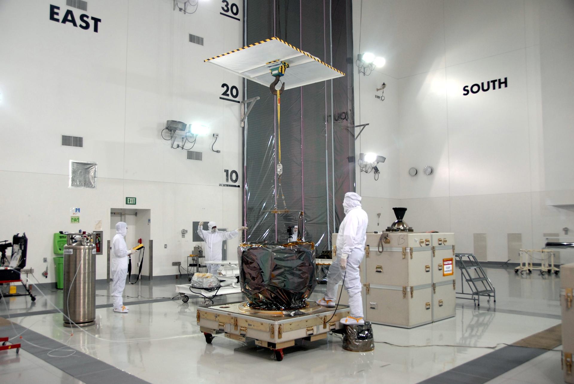 VANDENBERG AIR FORCE BASE, Calif. – At Vandenberg Air Force Base in California, an overhead crane is ready to lift NASA's Interstellar Boundary Explorer, or IBEX, mission spacecraft and move it to a nearby mobile stand.The IBEX satellite will make the first map of the boundary between the Solar System and interstellar space. IBEX is the first mission designed to detect the edge of the Solar System. As the solar wind from the sun flows out beyond Pluto, it collides with the material between the stars, forming a shock front. IBEX contains two neutral atom imagers designed to detect particles from the termination shock at the boundary between the Solar System and interstellar space. IBEX also will study galactic cosmic rays, energetic particles from beyond the Solar System that pose a health and safety hazard for humans exploring beyond Earth orbit. IBEX will make these observations from a highly elliptical orbit that takes it beyond the interference of the Earth's magnetosphere. IBEX is targeted for launch from the Pegasus XL rocket on Oct. 5. Photo credit: NASA/Mark Mackley