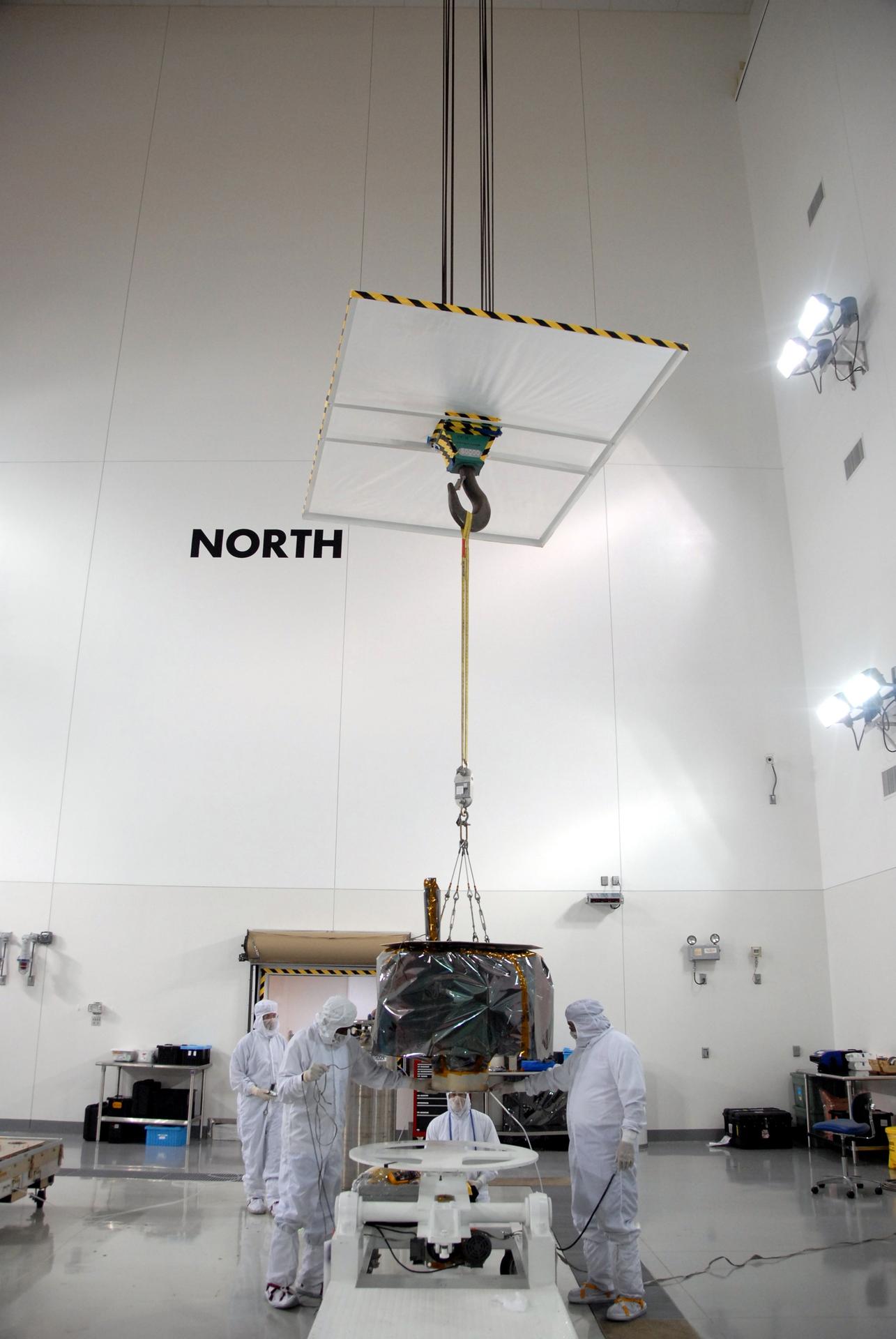 VANDENBERG AIR FORCE BASE, Calif. – At Vandenberg Air Force Base in California, technicians follow the movement of NASA's Interstellar Boundary Explorer, or IBEX, mission spacecraft toward the mobile stand in the foreground. The IBEX satellite will make the first map of the boundary between the Solar System and interstellar space. IBEX is the first mission designed to detect the edge of the Solar System. As the solar wind from the sun flows out beyond Pluto, it collides with the material between the stars, forming a shock front. IBEX contains two neutral atom imagers designed to detect particles from the termination shock at the boundary between the Solar System and interstellar space. IBEX also will study galactic cosmic rays, energetic particles from beyond the Solar System that pose a health and safety hazard for humans exploring beyond Earth orbit. IBEX will make these observations from a highly elliptical orbit that takes it beyond the interference of the Earth's magnetosphere. IBEX is targeted for launch from the Pegasus XL rocket on Oct. 5. Photo credit: NASA