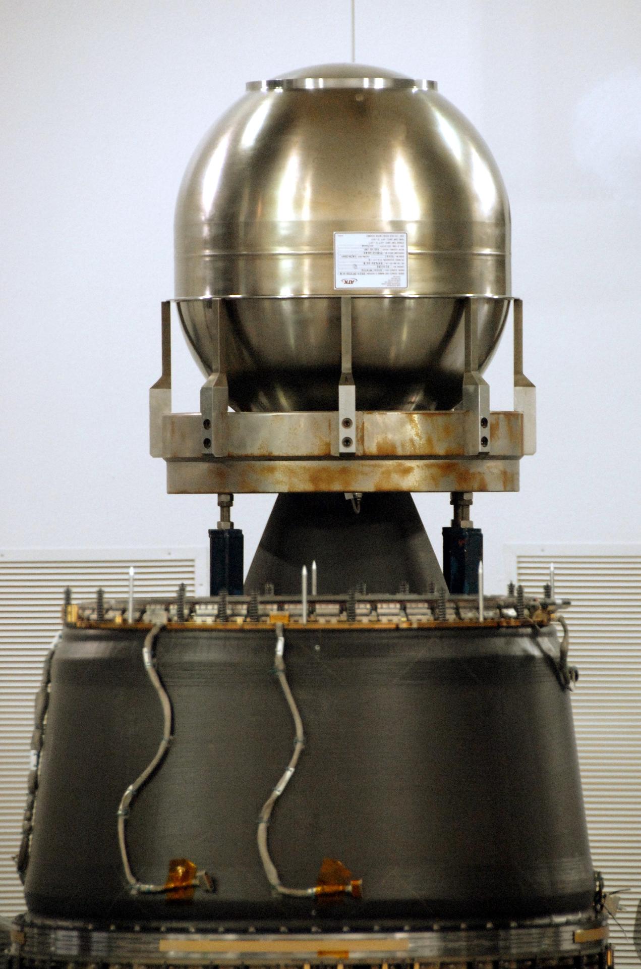 VANDENBERG AIR FORCE BASE, Calif. – At Vandenberg Air Force Base in California, the Star-27 kick motor and nozzle for NASA's Interstellar Boundary Explorer, or IBEX, spacecraft are “on top” and part of the IBEX flight system, known as the adapter cone, is in the foreground/bottom. The Star-27 motor has a silver tank that contains the solid propellant. The nozzle fits down inside the adapter cone. The IBEX satellite will make the first map of the boundary between the Solar System and interstellar space. IBEX is the first mission designed to detect the edge of the Solar System. As the solar wind from the sun flows out beyond Pluto, it collides with the material between the stars, forming a shock front. IBEX contains two neutral atom imagers designed to detect particles from the termination shock at the boundary between the Solar System and interstellar space. IBEX also will study galactic cosmic rays, energetic particles from beyond the Solar System that pose a health and safety hazard for humans exploring beyond Earth orbit. IBEX will make these observations from a highly elliptical orbit that takes it beyond the interference of the Earth's magnetosphere. IBEX is targeted for launch from the Pegasus XL rocket on Oct. 5. Photo credit: NASA/R. Bledsoe