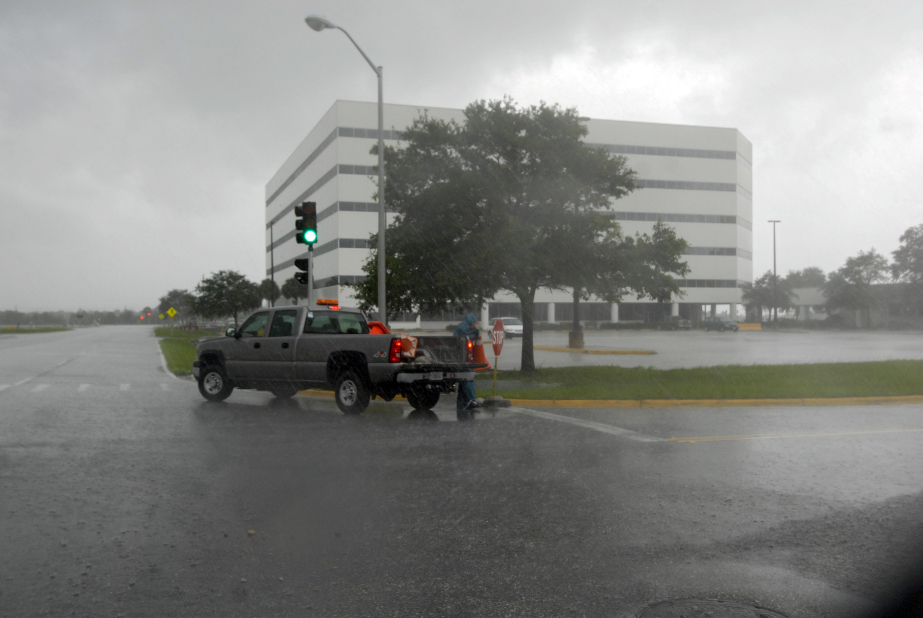 CAPE CANAVERAL, Fla. – A member of the "ride-out crew," a group of emergency personnel, at NASA's Kennedy Space Center monitors effects from Tropical Storm Fay. In the background is the Operations Support Building I in the Launch Complex 39 Area. The storm passed over the center Aug. 20 and then stalled offshore, bringing with it heavy rain and tropical storm force wind. Kennedy closed Aug. 19 because of Fay and reopened for normal operations Aug. 22. Based on initial assessments, there was no damage to space flight hardware, such as the space shuttles and Hubble Space Telescope equipment. Some facilities did sustain minor damage. Photo credit: NASA/Jack Pfaller