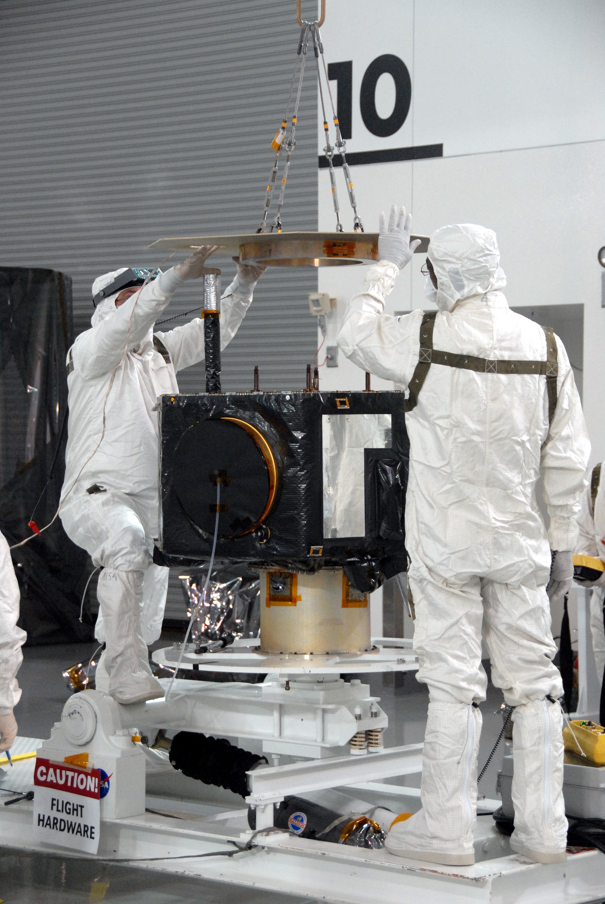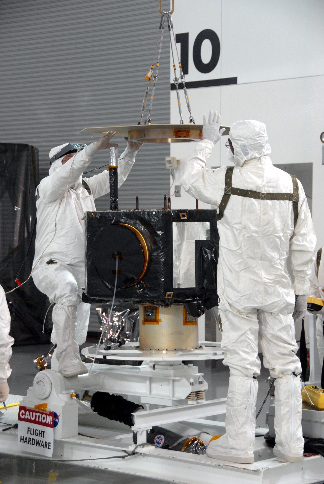 VANDENBERG AIR FORCE BASE, Calif. - At Vandenberg Air Force Base in California, technicians help guide an overhead crane toward NASA's Interstellar Boundary Explorer, or IBEX, spacecraft below it. IBEX is undergoing spin balance testing. The IBEX satellite will make the first map of the boundary between the Solar System and interstellar space. IBEX is the first mission designed to detect the edge of the Solar System. As the solar wind from the sun flows out beyond Pluto, it collides with the material between the stars, forming a shock front. IBEX contains two neutral atom imagers designed to detect particles from the termination shock at the boundary between the Solar System and interstellar space. IBEX also will study galactic cosmic rays, energetic particles from beyond the Solar System that pose a health and safety hazard for humans exploring beyond Earth orbit. IBEX will make these observations from a highly elliptical orbit that takes it beyond the interference of the Earth's magnetosphere. IBEX is targeted for launch from a Pegasus XL rocket on Oct. 5. Photo credit: NASA/VAFB