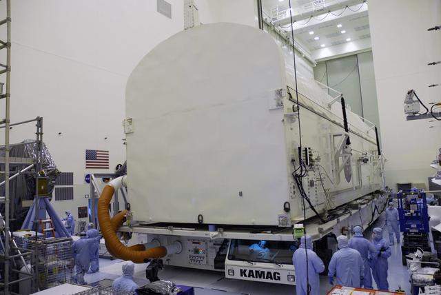 CAPE CANAVERAL, Fla. - The payload canister backs into the Payload Hazardous Servicing Facility at NASA’s Kennedy Space Center. The equipment and carriers associated with the STS-125 mission to service the Hubble Space Telescope will be installed in the canister for transfer to Launch Pad 39A. The canister contains an environmental control system, signified by the red umbilical lines at left. At the pad, the carriers will be loaded into space shuttle Atlantis’ payload bay. Launch of Atlantis is targeted for Oct. 10. Photo credit: NASA/Cory Huston