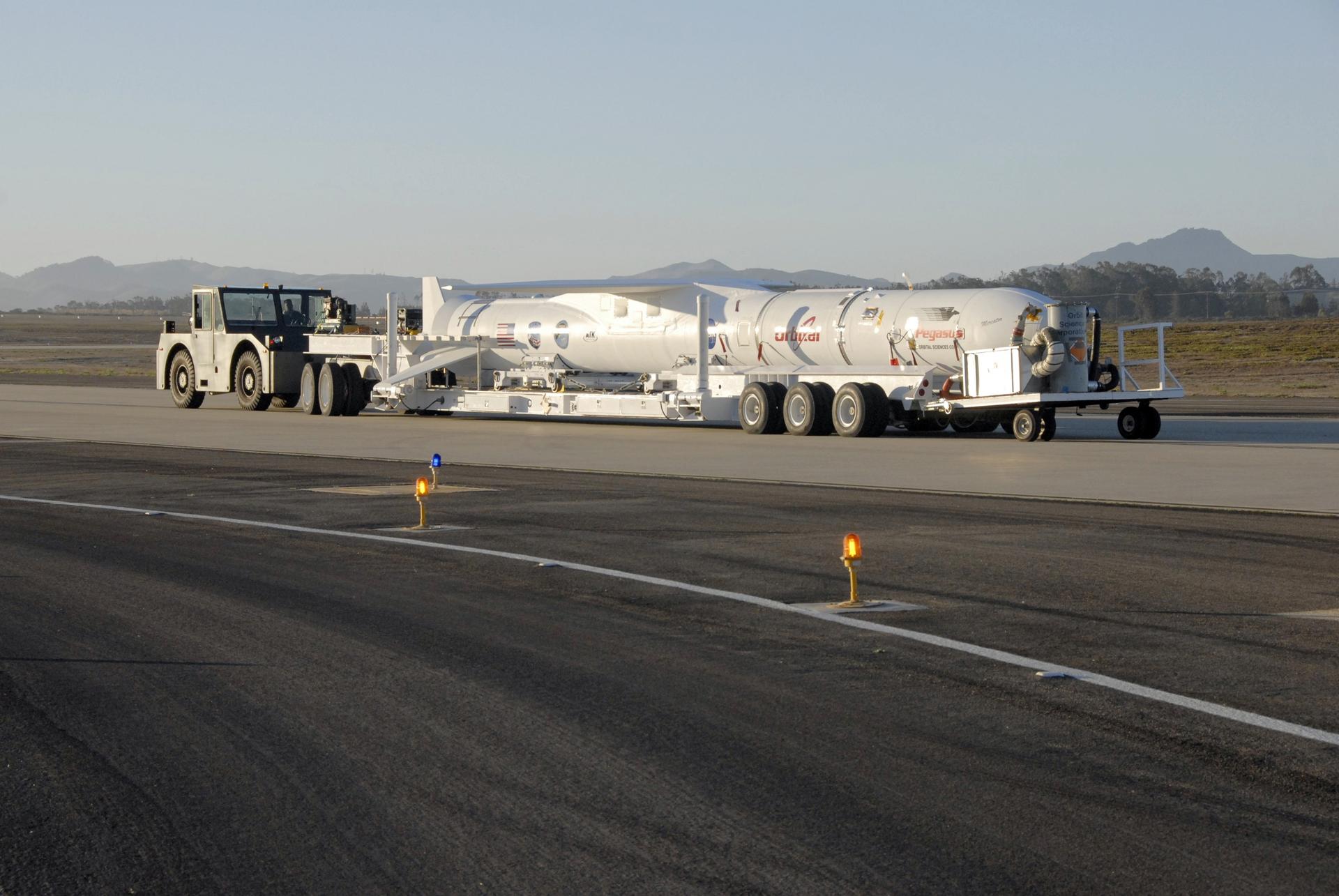 VANDENBERG AIR FORCE BASE, Fla. -- NASA’s Interstellar Boundary Explorer, or IBEX, spacecraft and mated Pegasus XL rocket are transported to the ramp on Vandenberg Air Force Base in California. There, the rocket will be attached to Orbital Sciences’ L-1011 aircraft for launch. IBEX is targeted for launch from the Kwajalein Atoll, a part of the Marshall Islands in the Pacific Ocean, on Oct. 19. IBEX will be launched aboard the Pegasus rocket dropped from under the wing of the L-1011 aircraft flying over the Pacific Ocean. The Pegasus will carry the spacecraft approximately 130 miles above Earth and place it in orbit. The IBEX satellite will make the first map of the boundary between the Solar System and interstellar space. Photo credit: NASA/Mark Mackley, VAFB