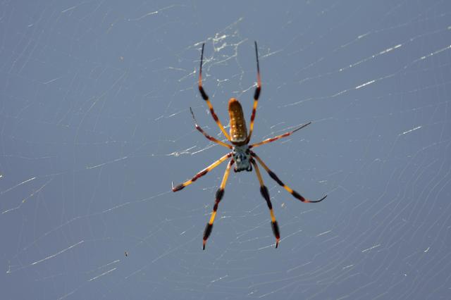 CAPE CANAVERAL, Fla. - On the grounds of Kennedy Space Center, a female Golden-Silk Spider repairs its web. The female can be identified by its brownish-green abdomen with a white spotted irregular pattern. The golden-silk spider repairs the webbing each day, replacing half but never the whole web at one time. Its web may measure two to three feet across. The center shares a boundary with the Merritt Island Wildlife Nature Refuge, consisting of 140,000 acres. The Refuge provides a wide variety of habitats: coastal dunes, saltwater estuaries and marshes, freshwater impoundments, scrub, pine flatwoods, and hardwood hammocks that provide habitat for more than 1,500 species of plants and animals. Photo credit: NASA/Dimitri Gerondidakis