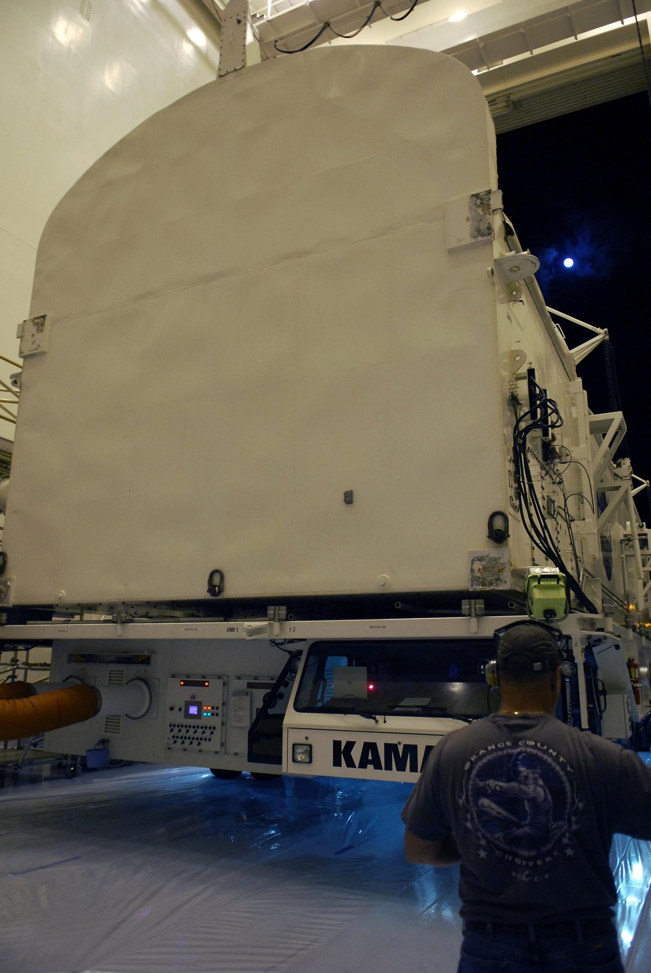 CAPE CANAVERAL, Fla. – At NASA's Kennedy Space Center in Florida, the payload canister with the Hubble Space Telescope equipment moves inside the Payload Hazardous Servicing Facility, or PHSF. The payload comprises four carriers holding various equipment for the mission. The canister maintains a controlled environment. In the PHSF, the carriers will be stored until a new target launch date can be set for Atlantis’ STS-125 mission in 2009. Atlantis’ October target launch date was delayed after a device on board Hubble used in the storage and transmission of science data to Earth shut down on Sept. 27. Replacing the broken device will be added to Atlantis’ servicing mission to the telescope. Photo credit: NASA/Troy Cryder