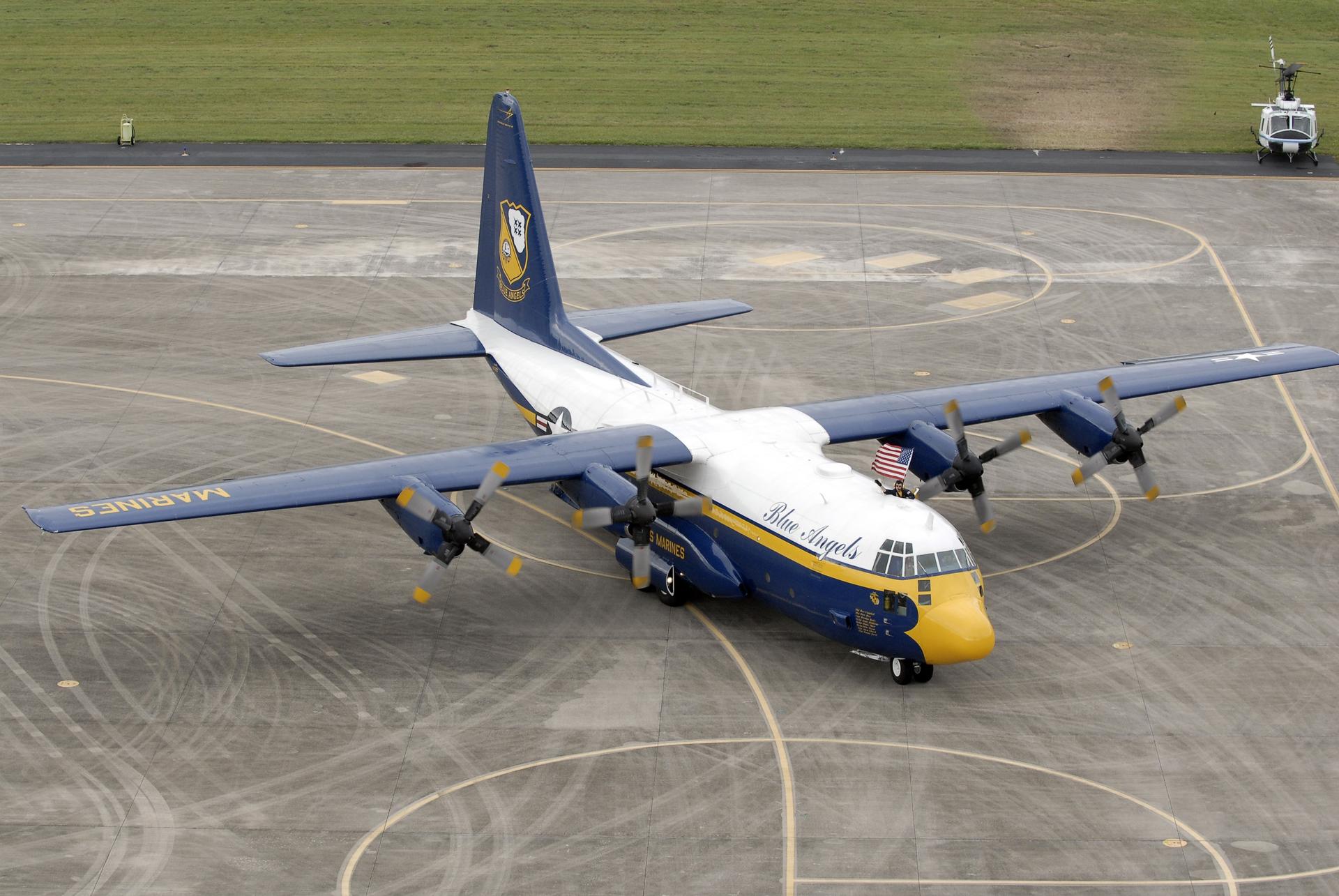 CAPE CANAVERAL, Fla. – A C-130 airplane flown by U.S. Marines lands at the Shuttle Landing Facility at NASA's Kennedy Space Center in Florida. The plane carries the support team for the U.S. Navy's Blue Angels, who are going to perform at the Kennedy Space Center Visitor Complex Space and Air Show Nov. 8-9. The Navy's elite flight demonstration squadron will take to the skies in military aircraft demonstrations by the F-16 Fighting Falcon and F/A-18 Super Hornet jets for the second annual Space & Air Show at Kennedy. This year’s show brings together the best in military aircraft, coupled with precision pilots and veteran astronauts to celebrate spaceflight and aviation. The event includes military aircraft demonstrations by the F-16 Fighting Falcon and a water rescue demonstration by the 920th Rescue Wing. Photo credit: NASA/Kim Shiflett