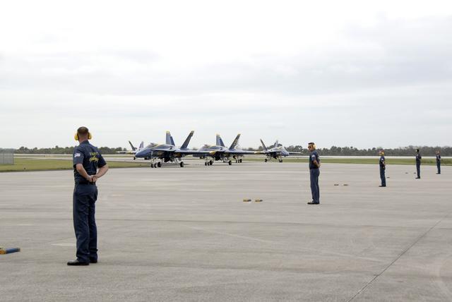CAPE CANAVERAL, Fla. – The U.S. Navy's Blue Angels demonstration squadron lands at the Shuttle Landing Facility at NASA's Kennedy Space Center in Florida. They will perform at the Kennedy Space Center Visitor Complex Space and Air Show Nov. 8-9. The Navy's elite flight demonstration squadron will take to the skies in military aircraft demonstrations by the F-16 Fighting Falcon and F/A-18 Super Hornet jets for the second annual Space & Air Show at Kennedy. This year’s show brings together the best in military aircraft, coupled with precision pilots and veteran astronauts to celebrate spaceflight and aviation. The event includes military aircraft demonstrations by the F-16 Fighting Falcon and a water rescue demonstration by the 920th Rescue Wing. Photo credit: NASA/Kim Shiflett