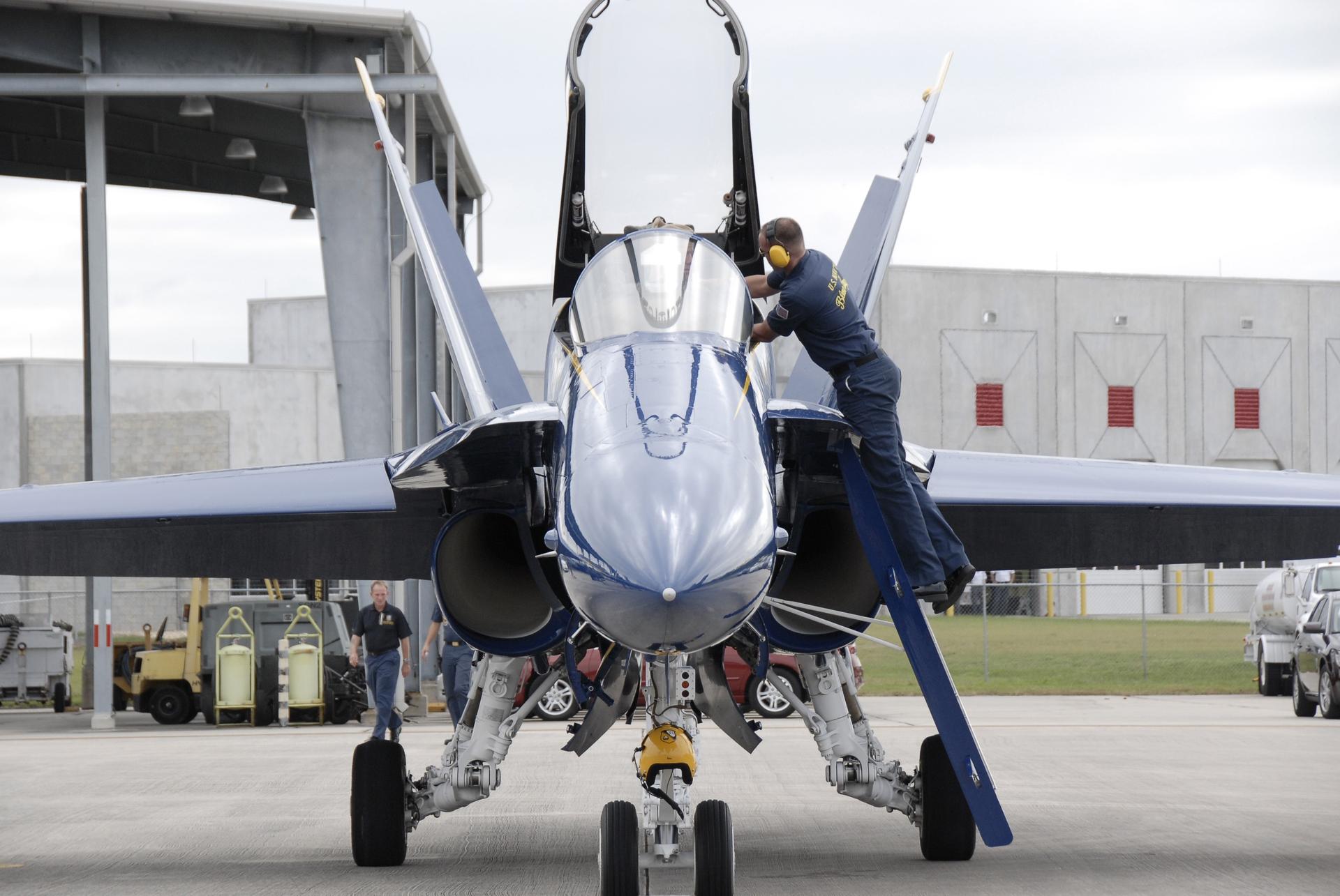CAPE CANAVERAL, Fla. – At the Shuttle Landing Facility at NASA's Kennedy Space Center in Florida, ground support personnel work on an F/A-18, one of the U.S. Navy's Blue Angels aircraft. The demonstration squadron will perform at the Kennedy Space Center Visitor Complex Space and Air Show Nov. 8-9. The Navy's elite flight demonstration squadron will take to the skies in military aircraft demonstrations by the F-16 Fighting Falcon and F/A-18 Super Hornet jets for the second annual Space & Air Show at Kennedy. This year’s show brings together the best in military aircraft, coupled with precision pilots and veteran astronauts to celebrate spaceflight and aviation. The event includes military aircraft demonstrations by the F-16 Fighting Falcon and a water rescue demonstration by the 920th Rescue Wing. Photo credit: NASA/Kim Shiflett