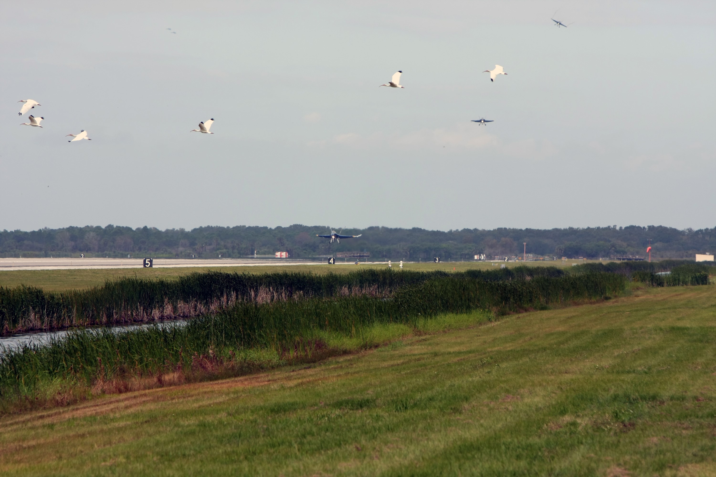 CAPE CANAVERAL, Fla. – Storks seem to join the formation as the U.S. Navy's Blue Angels F/A-18 jets land on the runway at NASA's Kennedy Space Center in Florida. The Blue Angels are at Kennedy to perform in the Kennedy Space Center Visitor Complex Space and Air Show Nov. 8-9. The Navy's elite flight demonstration squadron will take to the skies in military aircraft demonstrations by the F-16 Fighting Falcon and F/A-18 Super Hornet jets for the second annual Space & Air Show at Kennedy. This year’s show brings together the best in military aircraft, coupled with precision pilots and veteran astronauts to celebrate spaceflight and aviation. The event includes military aircraft demonstrations by the F-16 Fighting Falcon and a water rescue demonstration by the 920th Rescue Wing. Photo credit: NASA/Kim Shiflett