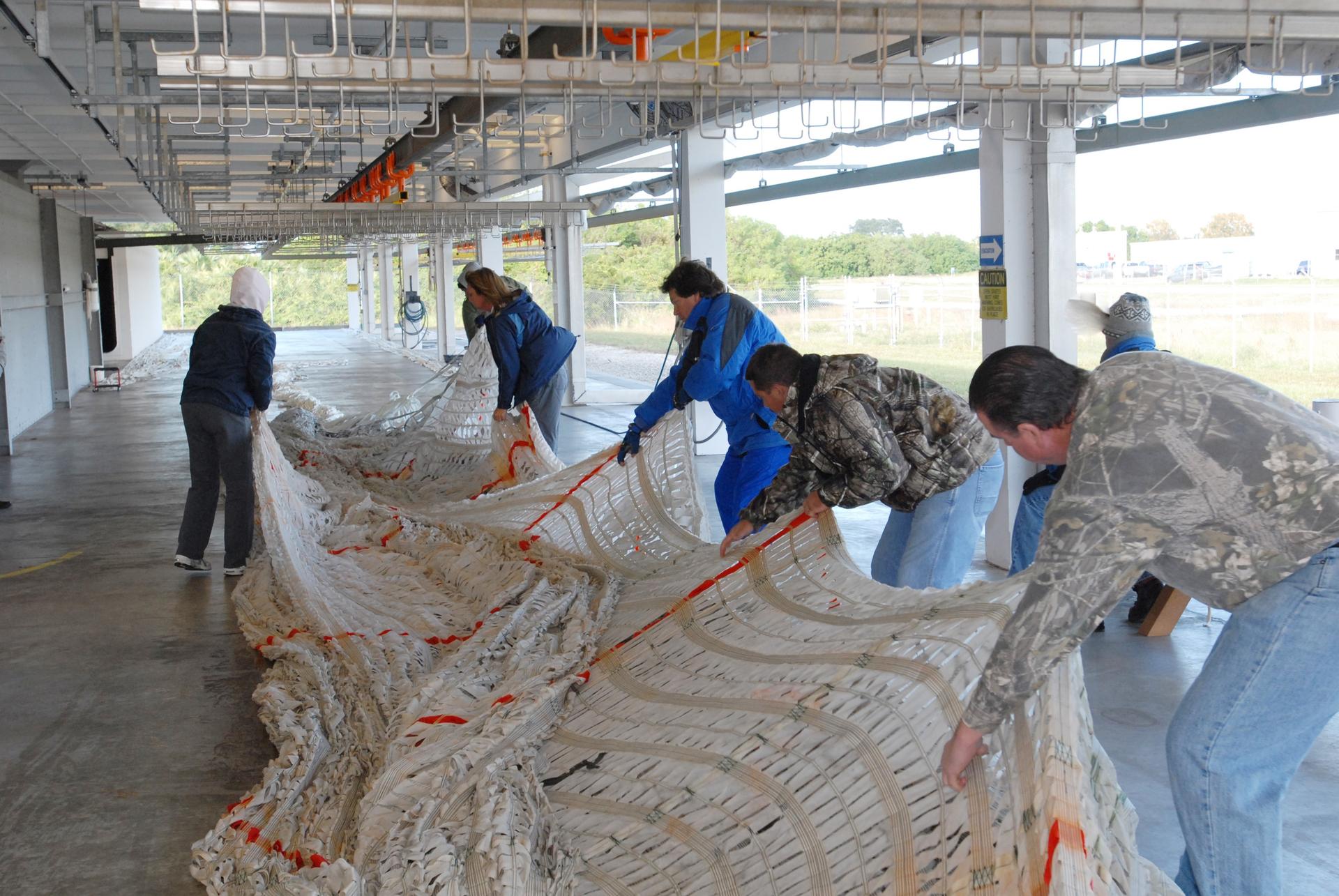 CAPE CANAVERAL, Fla. – At the Parachute Refurbishment Facility at NASA's Kennedy Space Center in Florida, workers spread out the parachutes recovered from sea after the launch of space shuttle Endeavour on the STS-126 mission to detangle them. The parachutes are used to slow the descent of the solid rocket boosters that are jettisoned during liftoff. One pilot, one drogue and three main canopies per booster slow the booster’s fall from about 360 mph to 50 mph. After the chutes are cleaned and repaired, they must be carefully packed into their bags so they will deploy correctly the next time they are used. Photo credit: NASA/Jim Grossmann