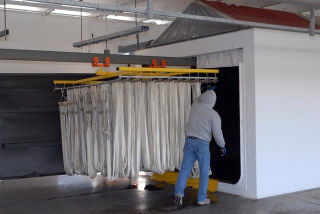 CAPE CANAVERAL, Fla. – At the Parachute Refurbishment Facility at NASA's Kennedy Space Center in Florida, a worker checks the parachute lines, recovered from sea after the launch of space shuttle Endeavour on the STS-126 mission, as they move into the 30,000-gallon washer. The parachutes are used to slow the descent of the solid rocket boosters that are jettisoned during liftoff. After washing, the monorail will move the parachutes into a huge dryer heated with 140-degree air at 13,000 cubic feet per minute. One pilot, one drogue and three main canopies per booster slow the booster’s fall from about 360 mph to 50 mph. After the chutes are cleaned and repaired, they must be carefully packed into their bags so they will deploy correctly the next time they are used. Photo credit: NASA/Jim Grossmann