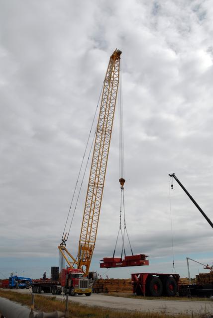 CAPE CANAVERAL, Fla. - On Launch Pad 39B at NASA’s Kennedy Space Center in Florida, the giant crane moves equipment that will be used to continue erecting the lightning towers. Each of the three new lightning towers will be 500 feet tall with an additional 100-foot fiberglass mast atop supporting a wire centenary system. This improved lightning protection system allows for the taller height of the Ares I compared to the space shuttle. Pad B will be the site of the first Ares vehicle launch, including Ares I-X which is targeted for summer of 2009, as part of NASA’s Constellation Program. Photo credit: NASA/Tim Jacobs