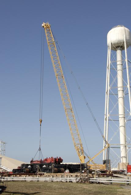CAPE CANAVERAL, Fla. -- On Launch Pad 39B at NASA’s Kennedy Space Center in Florida, the giant crane moves equipment that will be used to continue erecting the lightning towers. Each of the three new lightning towers will be 500 feet tall with an additional 100-foot fiberglass mast atop supporting a wire catenary system. This improved lightning protection system allows for the taller height of the Ares I compared to the space shuttle. Pad B will be the site of the first Ares vehicle launch, including Ares I-X which is targeted for summer of 2009, as part of NASA’s Constellation Program. Photo credit: NASA/Kim Shiflett