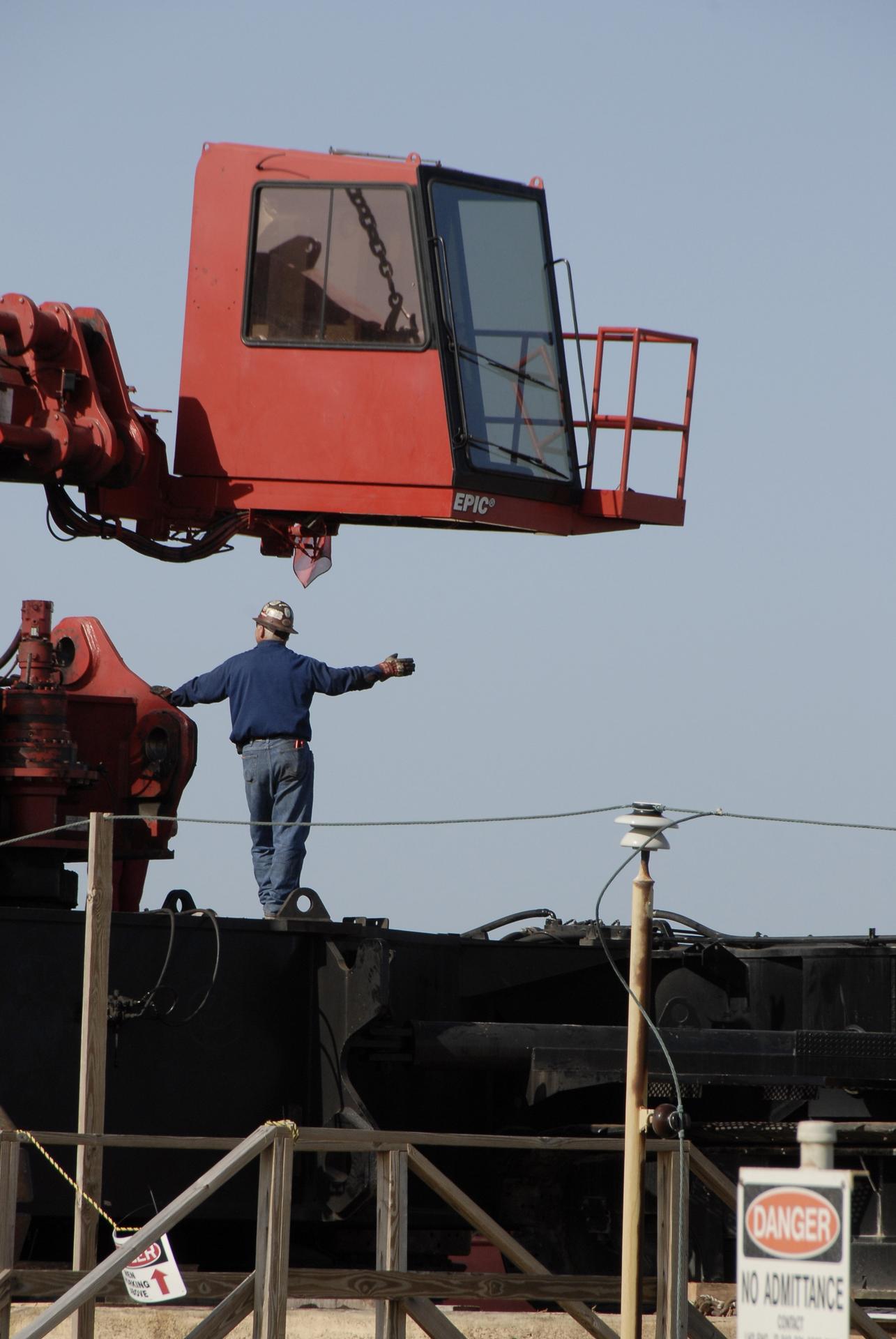 CAPE CANAVERAL, Fla. -- On Launch Pad 39B at NASA’s Kennedy Space Center in Florida, equipment is moved that will be used to continue erecting the lightning towers. Each of the three new lightning towers will be 500 feet tall with an additional 100-foot fiberglass mast atop supporting a wire catenary system. This improved lightning protection system allows for the taller height of the Ares I compared to the space shuttle. Pad B will be the site of the first Ares vehicle launch, including Ares I-X which is targeted for summer of 2009, as part of NASA’s Constellation Program. Photo credit: NASA/Kim Shiflett