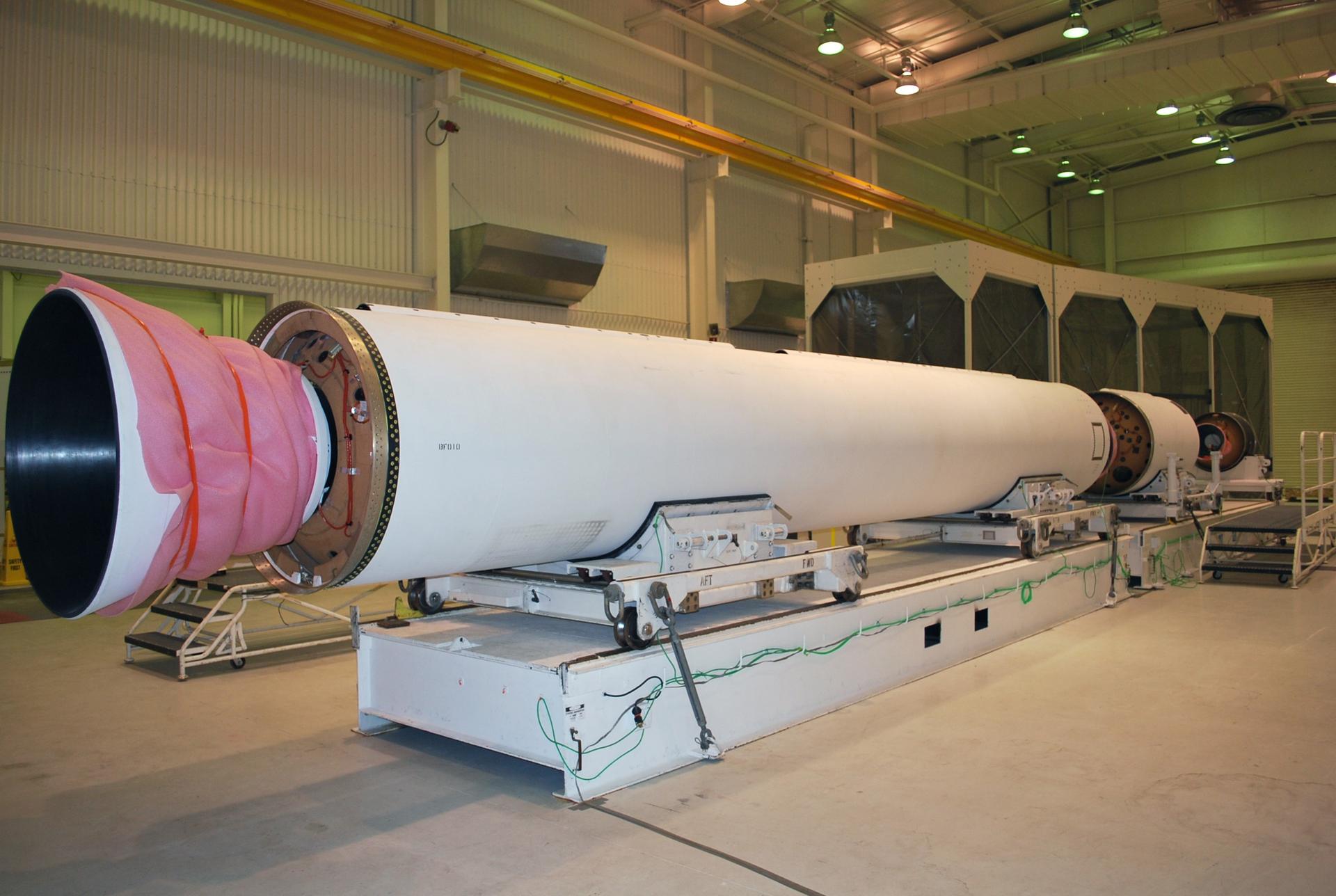 VANDENBERG AIR FORCE BASE, Calif. -- In the Orbital Sciences payload processing facility on Vandenberg Air Force Base in California, the first, second and third stage motors for the Glory spacecraft's Taurus XL rocket are lined up after arrival. Glory is a low-Earth orbit scientific research satellite designed to collect data on the properties and distributions of aerosols in the Earth's atmosphere and on solar irradiance for the long-term Earth climate record. Glory will be launched from Vandenberg aboard Orbital's Taurus XL 3110 launch vehicle. Photo credit: NASA/Randy Beaudoin, VAFB