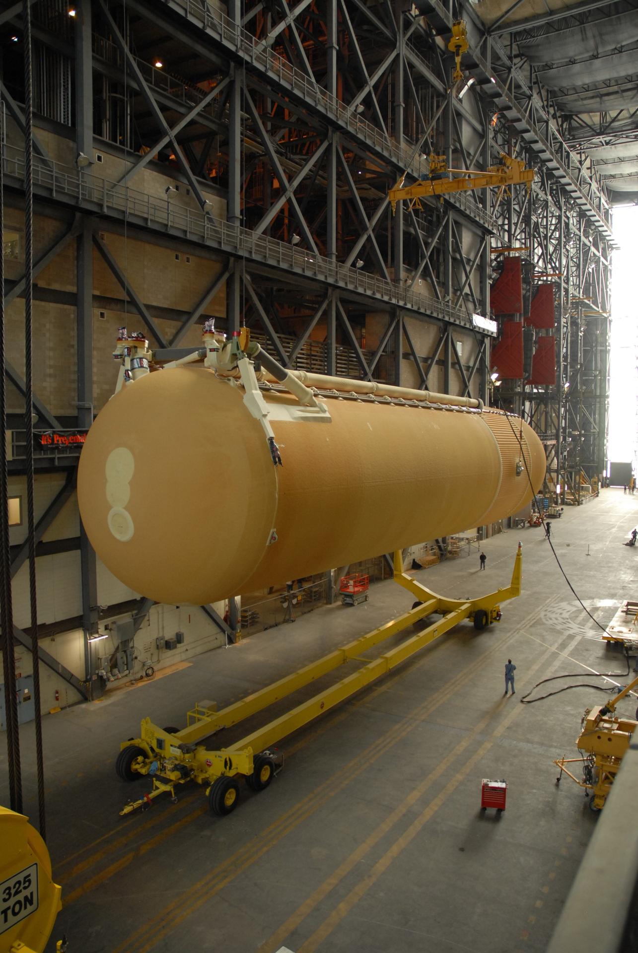 CAPE CANAVERAL, Fla. -- In the transfer aisle of the Vehicle Assembly Building at NASA's Kennedy Space Center in Florida, external fuel tank 130 is lifted off its transporter. The tank will be raised to vertical and lifted into high bay 2 for checkout. The fuel tank was previously designated for the STS-127 mission. The STS-125 Hubble servicing mission is targeted to launch May 12. Photo credit: NASA/Tim Jacobs