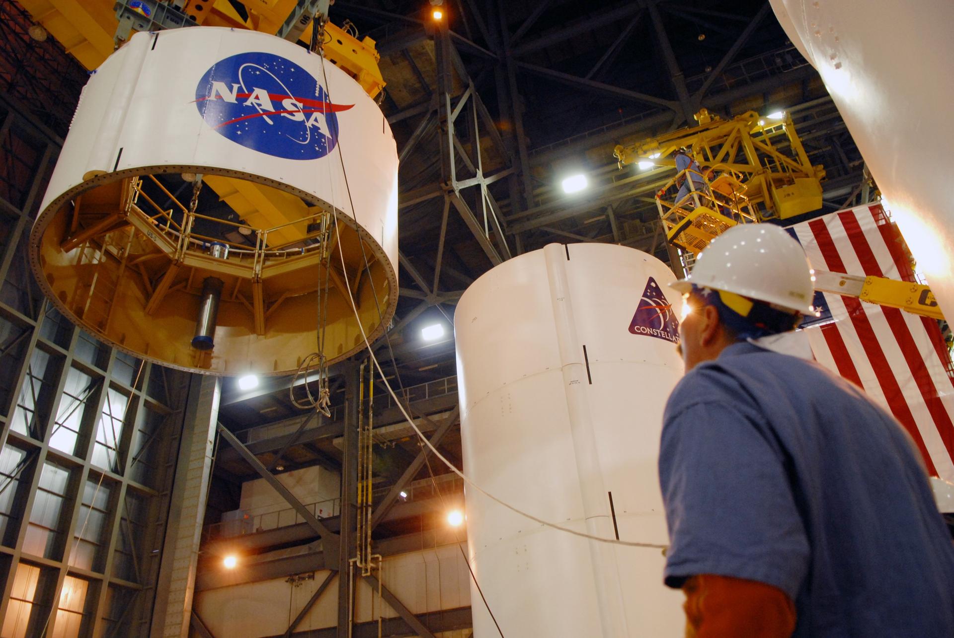 CAPE CANAVERAL, Fla. -- In high bay 4 of the Vehicle Assembly Building at NASA's Kennedy Space Center in Florida, a crane lifts segment 5 of the Ares I-X upper stage simulator segments toward the tall stack behind it. Segment 5 will be placed on segment 4, at top of the tall stack. The upper stage simulator comprises 11 segments, each approximately 18 feet in diameter, that will be used in the test flight known as Ares I-X in 2009. The simulator segments will simulate the mass and the outer mold line. The upper stage accounts for nearly one-quarter of the total height of the Ares I. It will take the Ares I on the second phase of its journey from Earth, providing the guidance, navigation and control needed for the second phase of the Ares I ascent flight. Photo credit: NASA/Troy Cryder