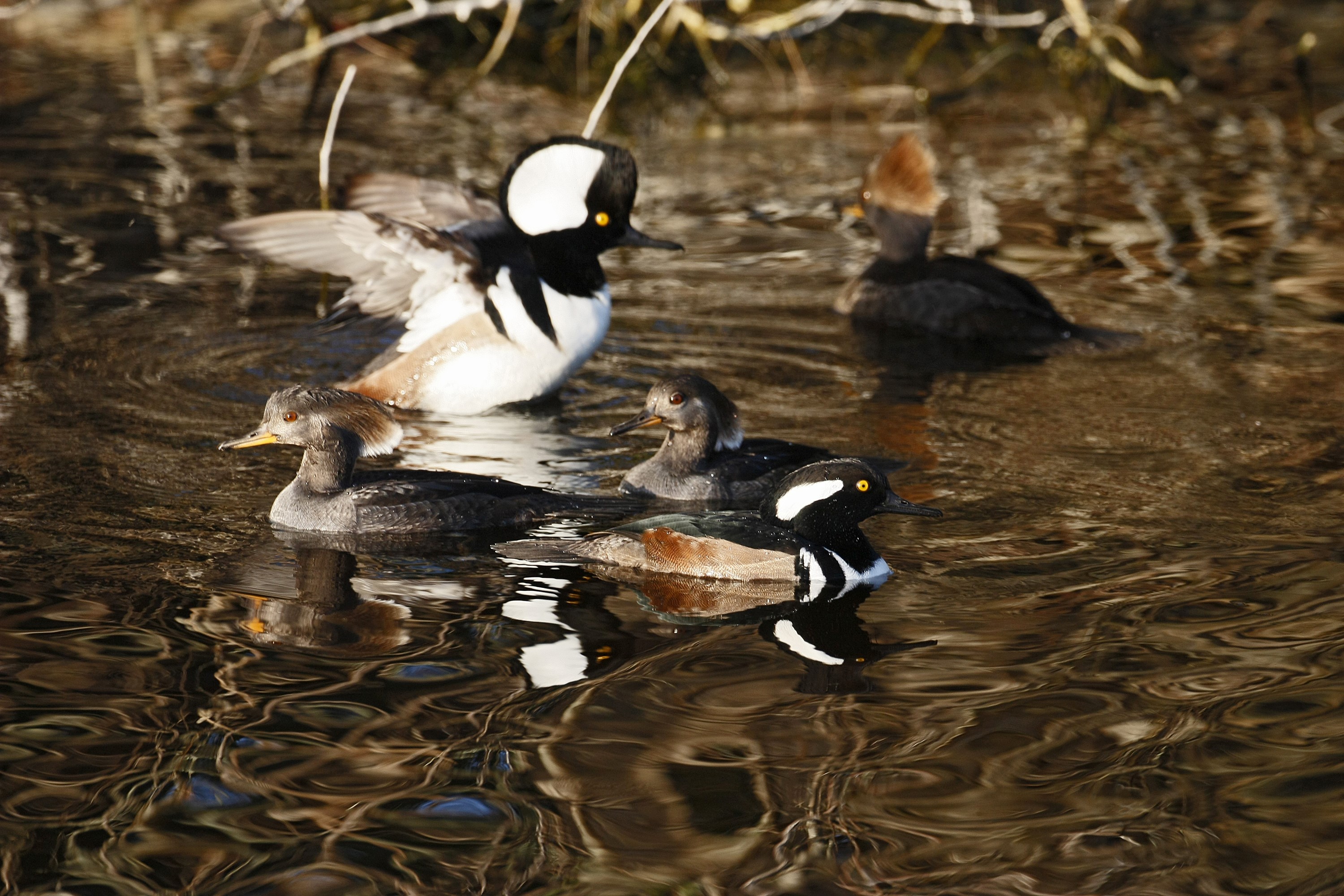 CAPE CANAVERAL, Fla. – Hooded Merganser ducks swim on a pond in the Merritt island National Wildlife Refuge, which borders NASA's Kennedy Space Center in Florida. Their habitat includes wooded ponds, lakes and rivers. They are most often seen along rivers and estuaries during the fall and winter. They feed chiefly on small fish, which they pursue in long, rapid, underwater dives, and also frogs and aquatic insects. The center shares a boundary with the refuge that includes salt-water estuaries, brackish marshes, hardwood hammocks and pine flatwoods. The diverse landscape provides habitat for more than 310 species of birds, 25 mammals, 117 fishes and 65 amphibians and reptiles. Photo credit: NASA/Jim Grossmann