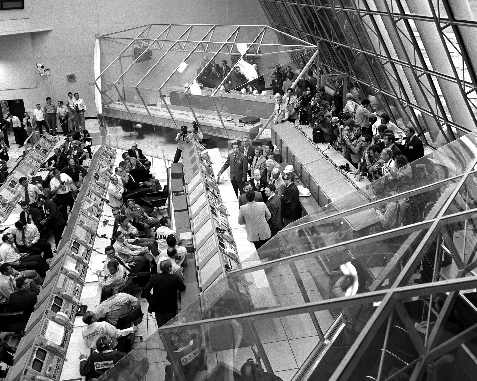 CAPE CANAVERAL, Fla. – The Soviet and American crews for the July Apollo Soyuz Test Project [standing, center] addressed personnel assembled in a firing room at KSC on February 10. The crews for the joint manned space mission toured the Center during their three-day visit which also included inspection of ASTP equipment and facilities and a trip to Disney World. The first international crewed spaceflight was a joint U.S.-U.S.S.R. rendezvous and docking mission. The Apollo-Soyuz Test Project, or ASTP, took its name from the spacecraft employed: the American Apollo and the Soviet Soyuz. The three-man Apollo crew lifted off from Kennedy Space Center aboard a Saturn IB rocket on July 15, 1975, to link up with the Soyuz that had launched a few hours earlier. A cylindrical docking module served as an airlock between the two spacecraft for transfer of the crew members. Photo credit: NASA