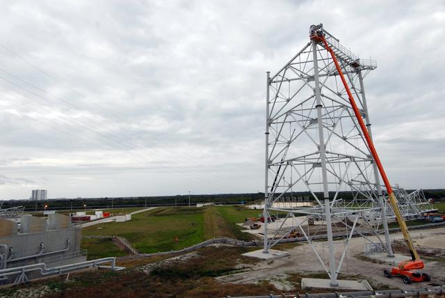 CAPE CANAVERAL, Fla. – CAPE CANAVERAL, Fla. -- On Launch Pad 39B at NASA's Kennedy Space Center in Florida, another lightning tower is being constructed as part of the new lightning protection system for the Constellation Program and Ares/Orion launches. Each of the three new lightning towers will be 500 feet tall with an additional 100-foot fiberglass mast atop supporting a wire catenary system. This improved lightning protection system allows for the taller height of the Ares I rocket compared to the space shuttle. Pad 39B will be the site of the first Ares vehicle launch, including the Ares I-X test flight that is targeted for July 2009. Photo credit: NASA/Troy Cryder