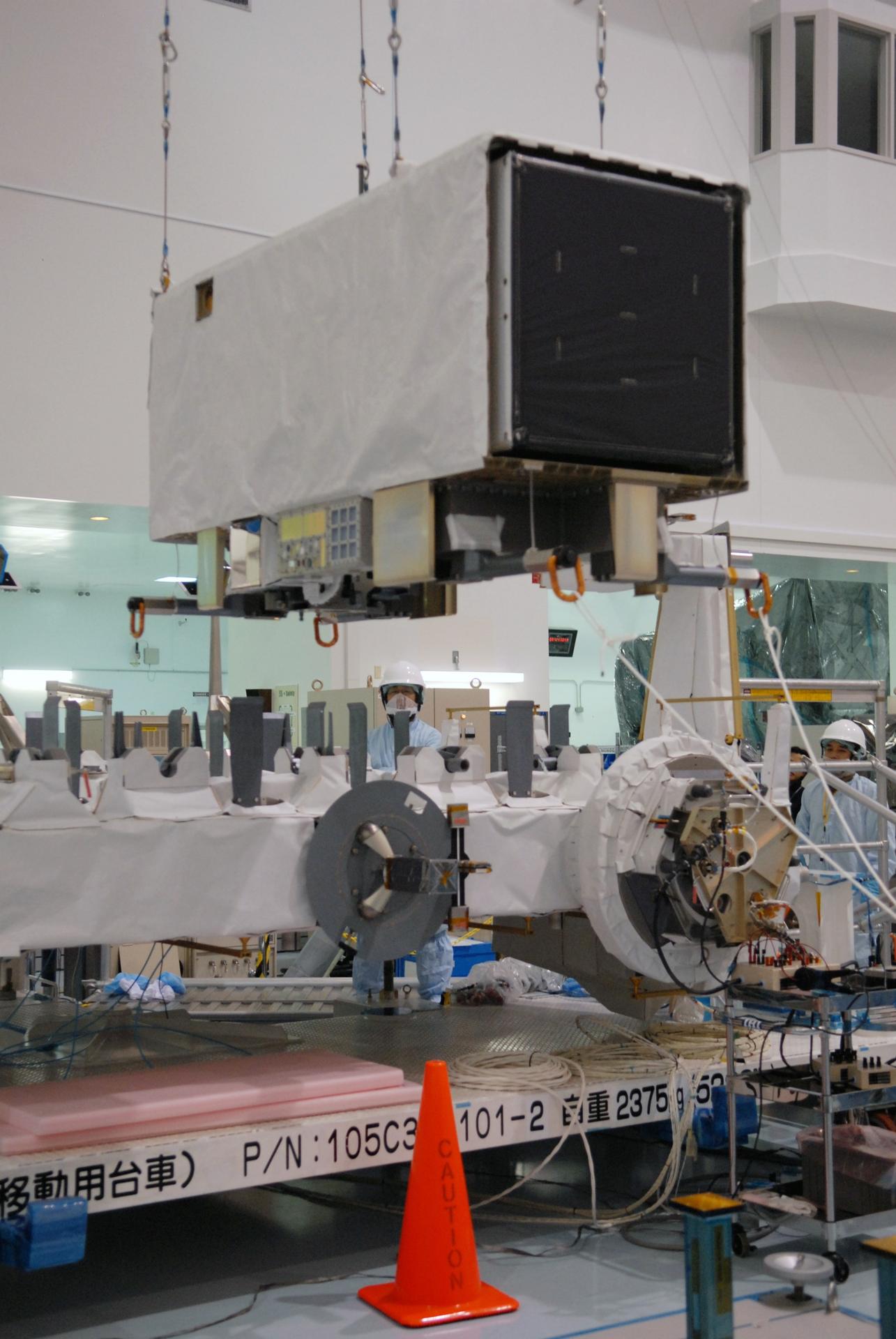 CAPE CANAVERAL, Fla. -- In the Space Station Processing Facility at NASA's Kennedy Space Center in Florida, the SEDA-AP (Space Environment Data Acquisition Equipment-Attached Payload) is lowered toward the Japanese Experiment Module's Experiment Logistics Module-Exposed Section, or ELM-ES for installation. The SEDA-AP and ELM-ES are part of space shuttle Endeavour's payload for the STS-127 mission. SEDA-AP will measure space environment in ISS orbit and environmental effects on materials and electronic devices to investigate the interaction with and from the environment at the Kibo exposed facility. Endeavour is targeted to launch May 15. Photo credit: NASA/Troy Cryder