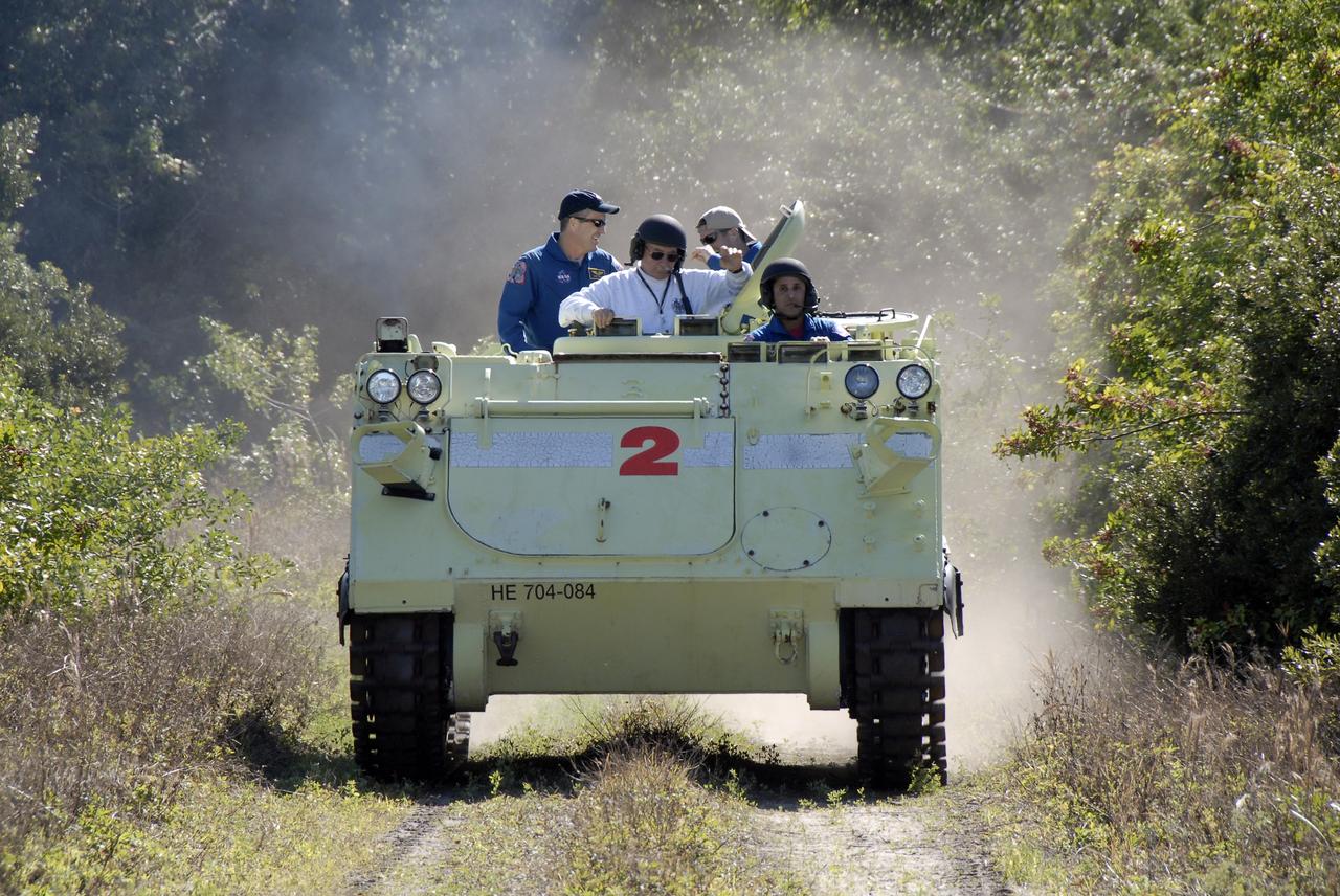 CAPE CANAVERAL, Fla. – At NASA's Kennedy Space Center in Florida, STS-119 Mission Specialist Joseph Acaba practices driving the M-113 armored personnel carrier used for emergency escape, if needed, from Launch Pad 39A. Next to him in front is astronaut rescue team leader Capt. George Hoggard. Behind are Mission Specialists Richard Arnold and Steve Swanson. The crew members are at Kennedy for prelaunch preparation known as terminal countdown demonstration test, or TCDT. The training provides astronauts and ground crews with an opportunity to participate in various simulated countdown activities, including equipment familiarization and a simulated launch countdown. The crew of space shuttle Discovery is targeted to launch on the STS-119 mission Feb. 12. During Discovery's 14-day mission, the crew will install the S6 truss segment and solar arrays to the starboard side of the International Space Station, completing the station's truss, or backbone. Photo credit: NASA/Kim Shiflett