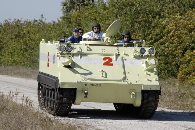 CAPE CANAVERAL, Fla. – At NASA's Kennedy Space Center in Florida, STS-119 Commander Lee Archambault drives the M-113 armored personnel carrier used for emergency escape, if needed, from Launch Pad 39A. Next to him in front is astronaut rescue team leader Capt. George Hoggard. Behind is Pilot Tony Antonelli and Mission Specialist Koichi Wakata, who represents the Japan Aerospace Exploration Agency. The crew members are at Kennedy for prelaunch preparation known as terminal countdown demonstration test, or TCDT. The training provides astronauts and ground crews with an opportunity to participate in various simulated countdown activities, including equipment familiarization and a simulated launch countdown. The crew of space shuttle Discovery is targeted to launch on the STS-119 mission Feb. 12. During Discovery's 14-day mission, the crew will install the S6 truss segment and solar arrays to the starboard side of the International Space Station, completing the station's truss, or backbone. Photo credit: NASA/Kim Shiflett