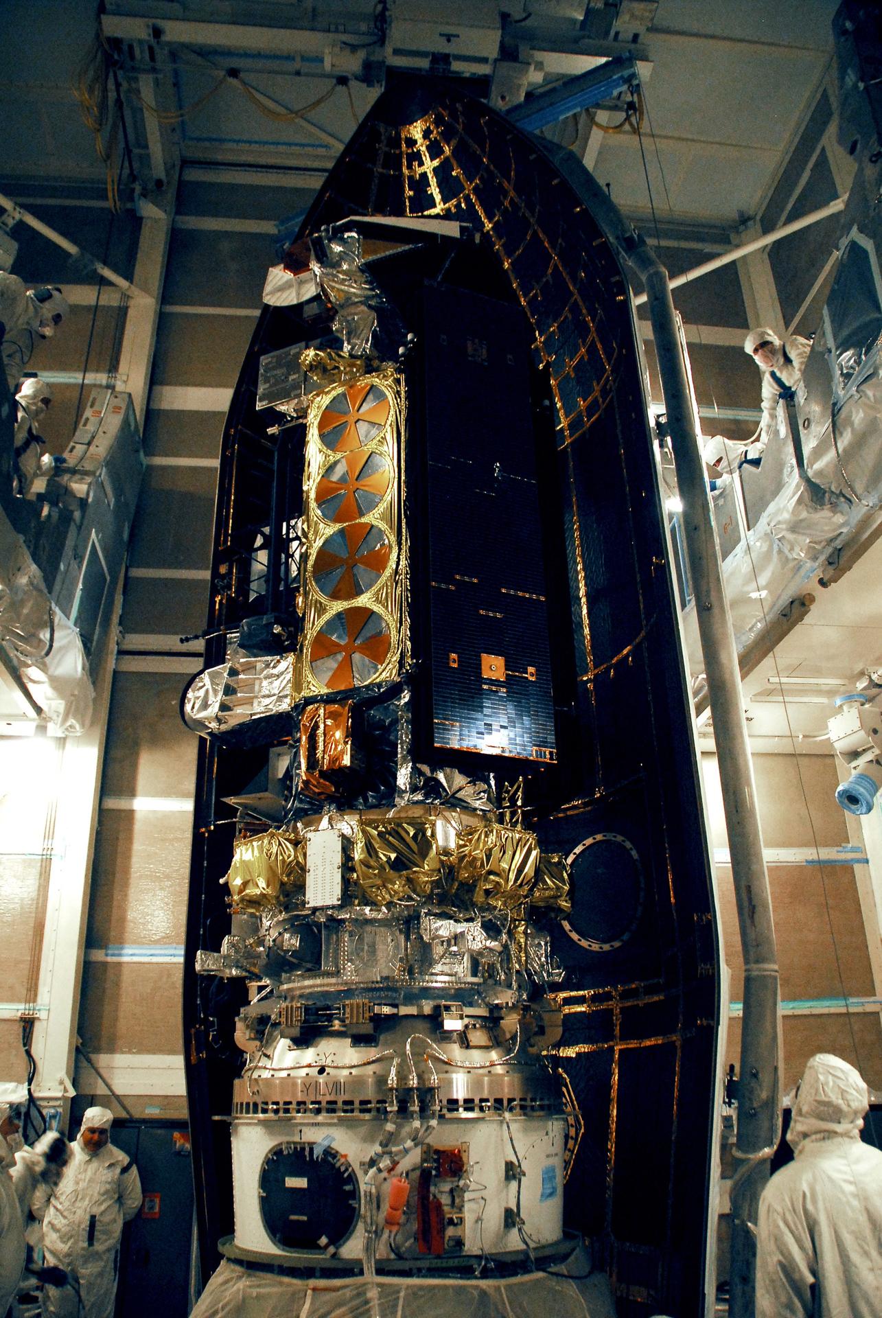 VANDENBERG AIR FORCE BASE, Calif. -- The first half of the fairing is moved into place around the NOAA-N Prime spacecraft in the launch service tower on Space Launch Complex 2 at Vandenberg Air Force Base in California. The fairing is a molded structure that fits flush with the outside surface of the rocket and forms an aerodynamically smooth nose cone, protecting the spacecraft during launch and ascent. NOAA-N Prime is the latest polar-orbiting operational environmental weather satellite developed by NASA for the National Oceanic and Atmospheric Administration. It is built by Lockheed Martin and similar to NOAA-N that was launched on May 20, 2005. Launch of NOAA-N Prime aboard a Delta II rocket is scheduled for Feb. 4. Photo credit: NASA