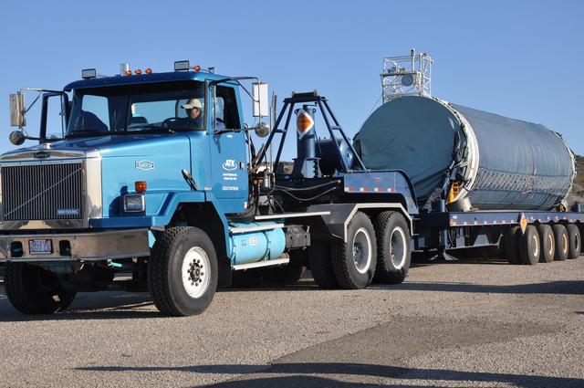 VANDENBERG AIR FORCE BASE, Calif. -- Stage 0 of the Taurus XL launch vehicle for the Orbiting Carbon Observatory arrives at complex 576E at Vandenberg Air Force Base in California. It will be mated with stages 1, 2 and 3 for the launch of OCO. The OCO is a new Earth-orbiting mission sponsored by NASA's Earth System Science Pathfinder Program. It is scheduled to launch Feb. 23. Photo credit: NASA/Randy Beaudoin, VAFB
