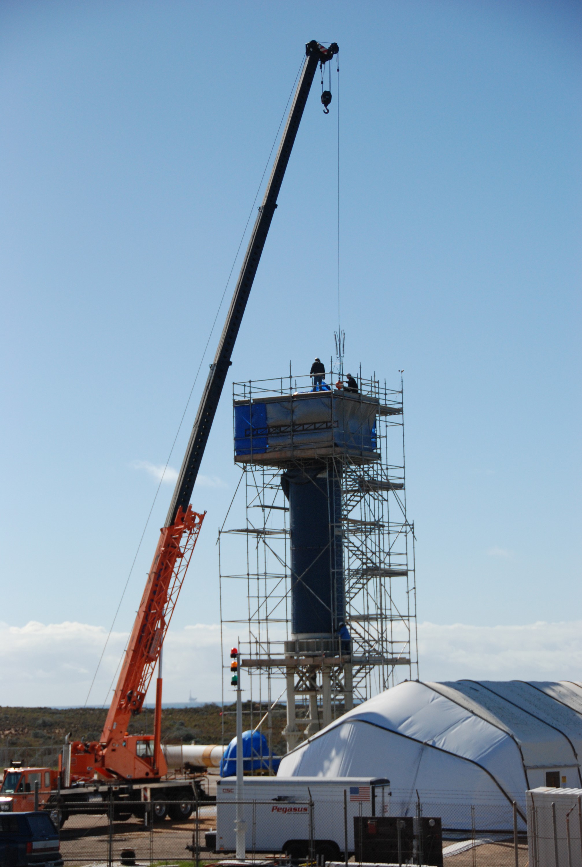 VANDENBERG AIR FORCE BASE, Calif. -- On Space Launch Complex 576-E at Vandenberg Air Force Base in California, scaffolding is built around Stage 0 of the Taurus XL launch vehicle for NASA’s Orbiting Carbon Observatory, or OCO, stacked on the launch mount. An umbilical tower is being erected on the pad using the portable crane. Stage 0 utilizes a Castor 120 Motor. The OCO is an Earth-orbiting mission sponsored by NASA's Earth System Science Pathfinder Program. The observatory will collect precise global measurements of carbon dioxide in the Earth's atmosphere. Scientists will analyze the data returned to better understand the natural processes and human activities that regulate the abundance and distribution of this important greenhouse gas. Launch is targeted for Feb. 24 from Space Launch Complex 576-E at Vandenberg. Photo credit: VAFB/Wayne North