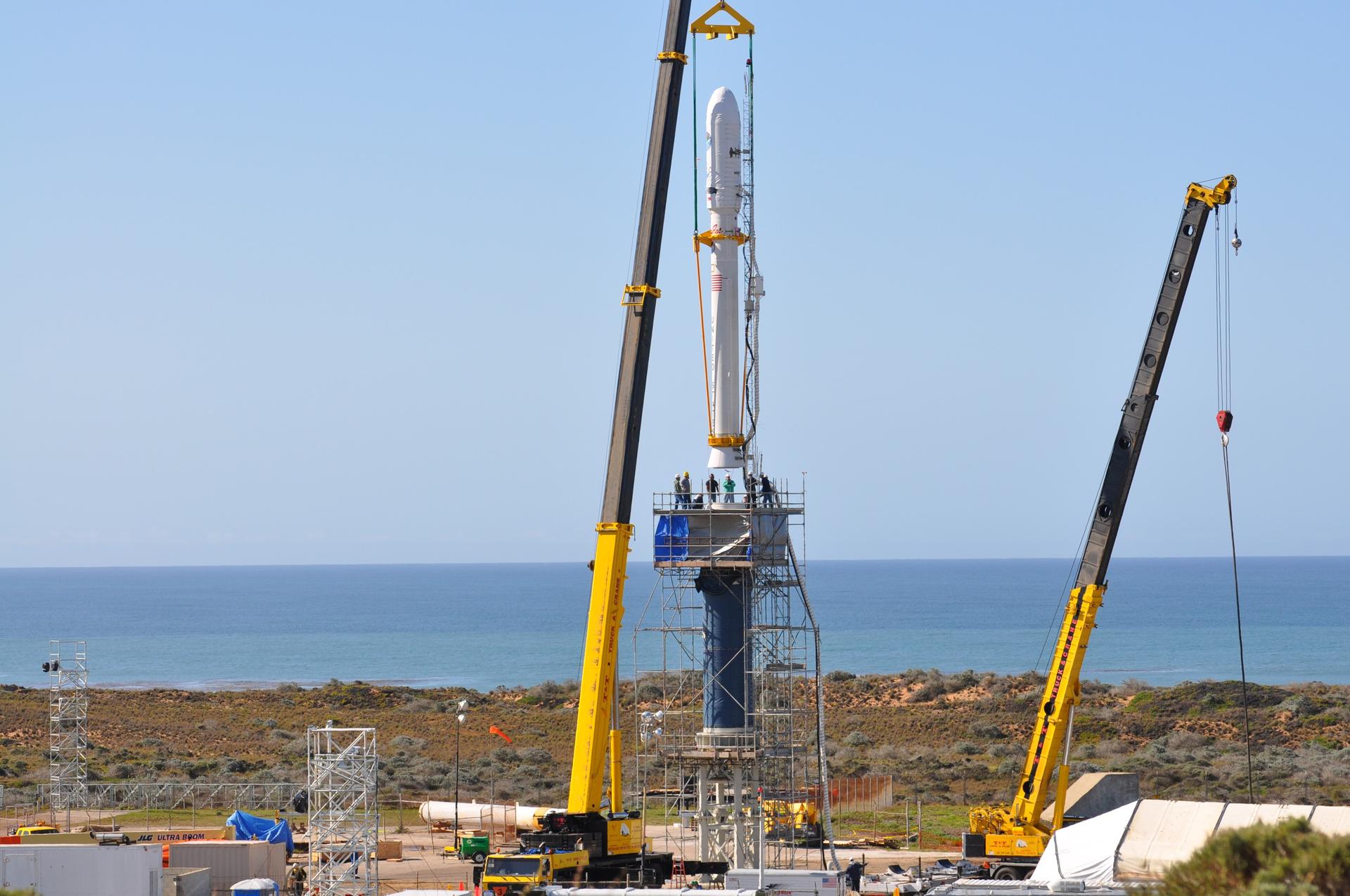 VANDENBERG AIR FORCE BASE, Calif. -- On Launch Complex 576-E at Vandenberg Air Force Base in California, NASA's Orbiting Carbon Observatory, OCO, upper stack is lowered toward the Stage 0 motor of the Taurus XL vehicle. The upper stack consists of Stages 1, 2 and 3 of the Taurus. The spacecraft is scheduled for launch aboard Orbital Sciences' Taurus XL rocket Feb. 24 from Vandenberg. The spacecraft will collect precise global measurements of carbon dioxide (CO2) in the Earth's atmosphere. Scientists will analyze OCO data to improve our understanding of the natural processes and human activities that regulate the abundance and distribution of this important greenhouse gas. Photo credit: NASA/Randy Beaudoin, VAFB
