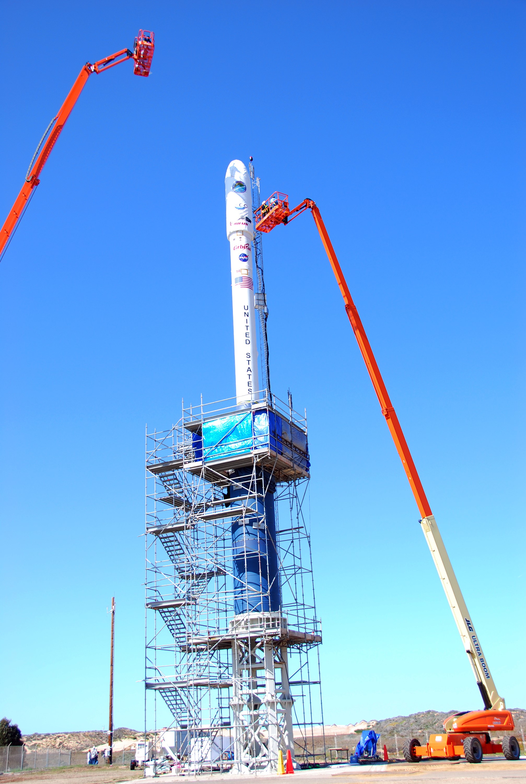 VANDENBERG AIR FORCE BASE, Calif. -- On Launch Complex 576-E at Vandenberg Air Force Base in California, Orbital Sciences Engineer Jose Castillo maneuvers the bucket truck into position over the fairing access door on NASA's Orbiting Carbon Observatory, or OCO. On the top of the OCO fairing is the shadow of Glenn Weigle of Orbital Satellite Systems Group, on the bucket at upper left, who is prepared to move in and inspect the GN2 instrument purge flow. OCO will collect precise global measurements of carbon dioxide (CO2) in the Earth's atmosphere. Scientists will analyze OCO data to improve our understanding of the natural processes and human activities that regulate the abundance and distribution of this important greenhouse gas. Photo credit: NASA/Richard Nielsen, KSC