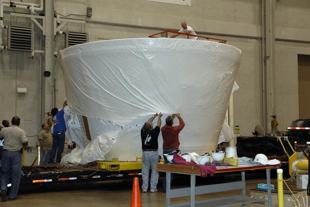 CAPE CANAVERAL, Fla. – In the Assembly and Refurbishment Facility of NASA's Kennedy Space Center, workers remove the cover from the frustum, the last newly manufactured section of the Ares I-X test rocket. Resembling a giant funnel, the frustum's function is to transition the primary flight loads from the rocket's upper stage to the first stage. The frustum is located between the forward skirt extension and the upper stage of the Ares I-X. Weighing in at approximately 13,000 pounds, the 10-foot-long section is composed of two aluminum rings attached to a truncated conic section. The large diameter of the cone is 18 feet and the small diameter is 12 feet. The cone is 1.25 inches thick. The frustum will be integrated with the forward skirt and forward skirt extension, which already are in the Assembly and Refurbishment Facility. That will complete the forward assembly. The assembly then will be moved to the Vehicle Assembly Building for stacking operations, which are scheduled to begin in April. Manufactured by Major Tool and Machine Inc. in Indiana under a subcontract with Alliant Techsystems Inc., or ATK, the Ares I-X is targeted to launch in the summer of 2009. The flight will provide NASA with an early opportunity to test and prove hardware, facilities and ground operations associated with the Ares I launch vehicle. The flight test also will bring NASA a step closer to its exploration goals of sending humans to the moon and destinations beyond. Photo credit: NASA/Kim Shiflett
