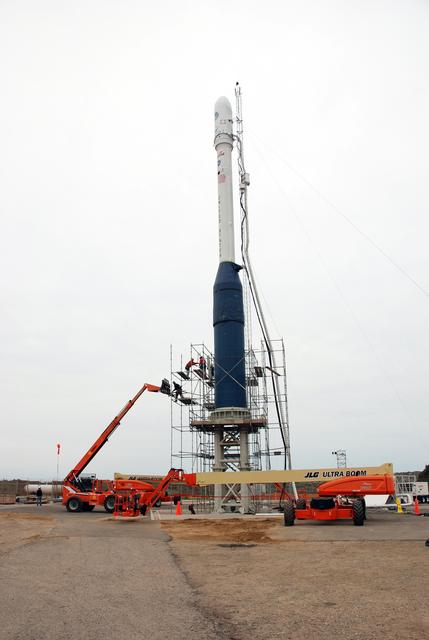 VANDENBERG AIR FORCE BASE, Calif. -- On Launch Complex 576-E at Vandenberg Air Force Base in California, workers remove the scaffolding surrounding Orbital Sciences' Taurus XL rocket. Atop the rocket is NASA's Orbiting Carbon Observatory, or OCO, which is scheduled to launch Feb. 24 from Vandenberg. The spacecraft will collect precise global measurements of carbon dioxide (CO2) in the Earth's atmosphere. Scientists will analyze OCO data to improve our understanding of the natural processes and human activities that regulate the abundance and distribution of this important greenhouse gas. Photo credit: NASA/Richard Nielsen, VAFB