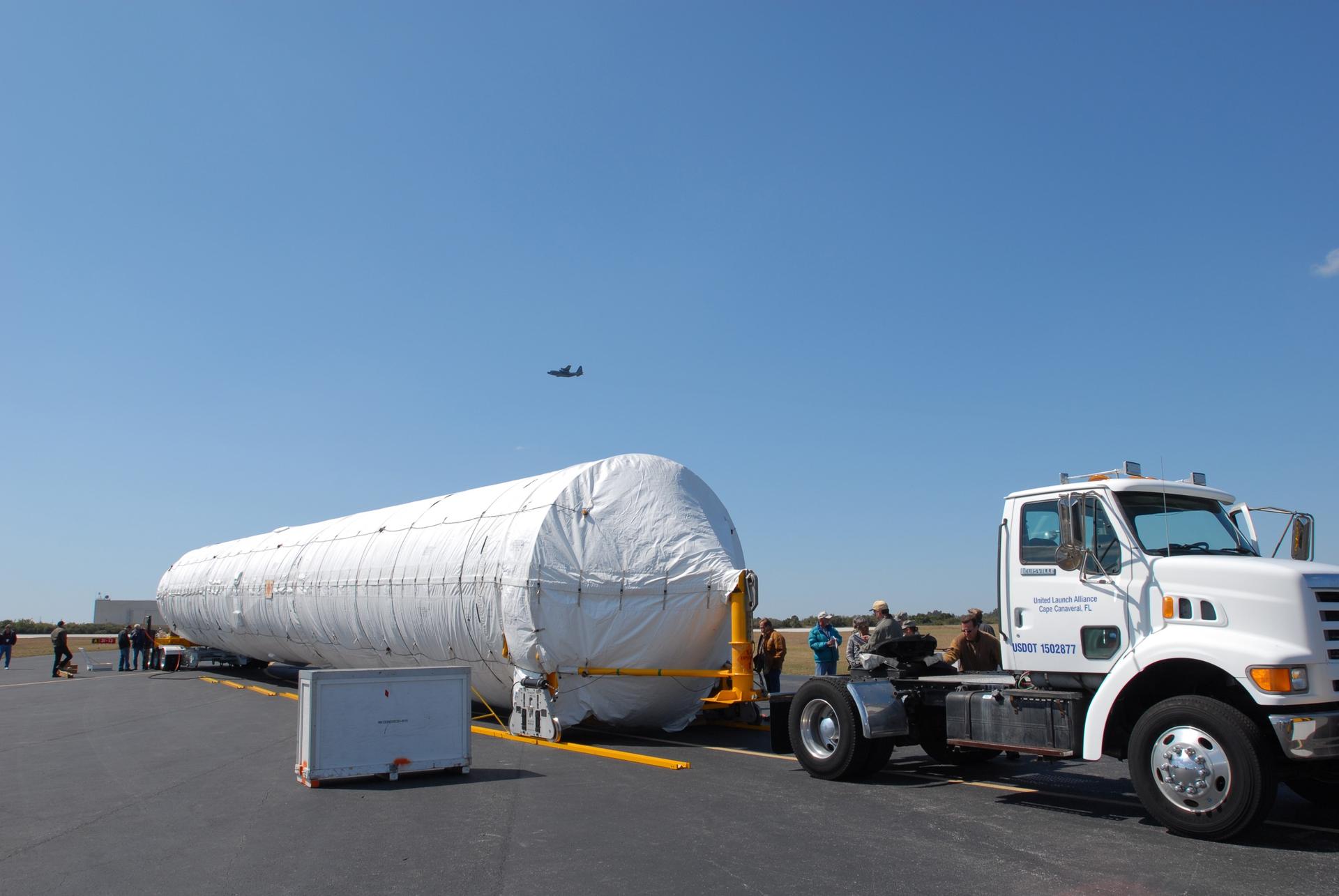 CAPE CANAVERAL, Fla. – On Cape Canaveral Air Force Station's skid strip in Florida, the shrouded Atlas V first stage booster is being prepared for its move to the Atlas Space Operations Center on CCAFS. The Atlas V is the launch vehicle for NASA's Lunar Reconnaissance Orbiter, or LRO, and NASA's Lunar CRater Observation and Sensing Satellite, known as LCROSS. Launch is scheduled no earlier than May 20. LCROSS and LRO are the first missions in NASA's plan to return humans to the moon and begin establishing a lunar outpost by 2020. Photo credit: NASA/Jim Grossmann