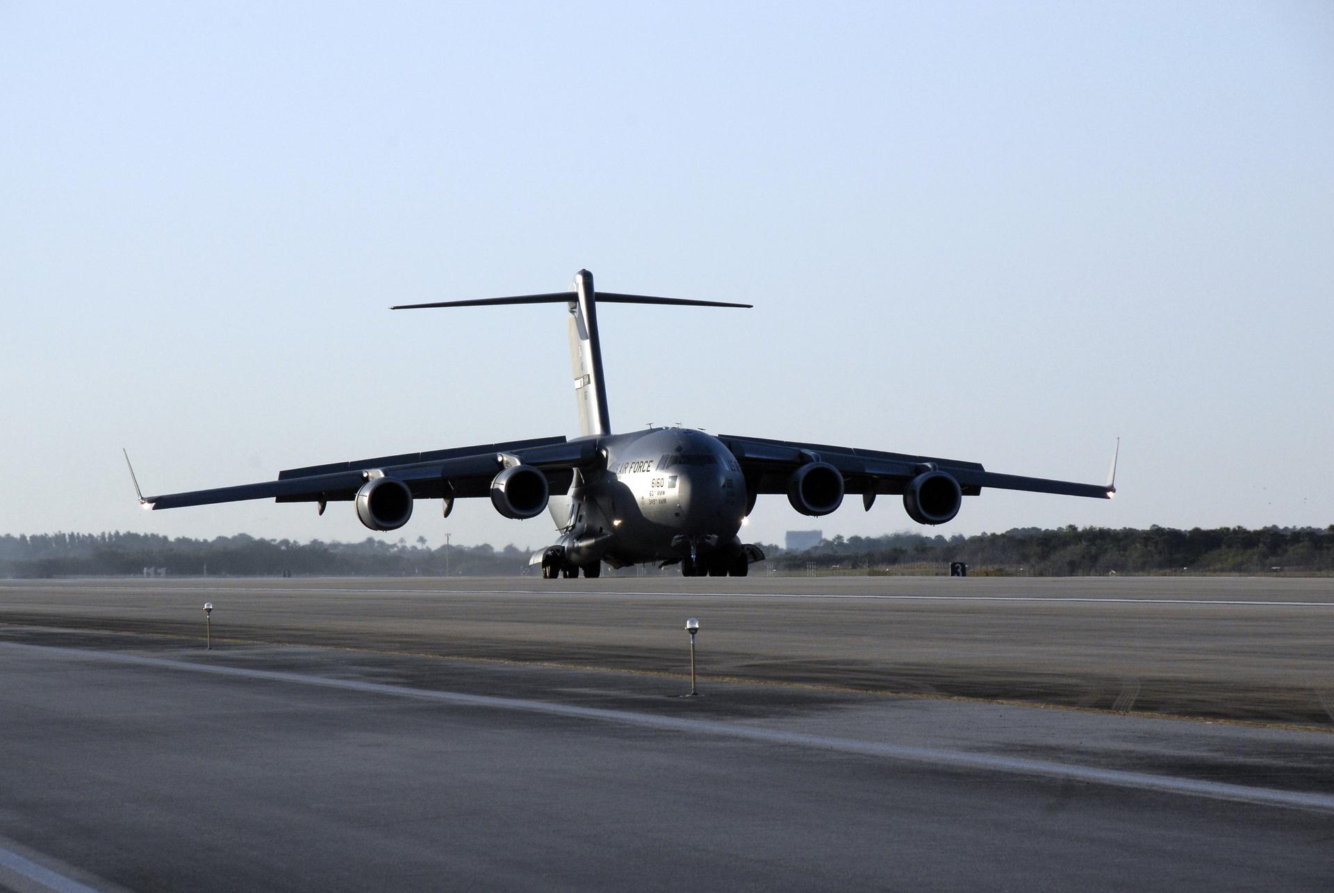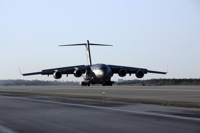 CAPE CANAVERAL, Fla. – The latest Geostationary Operational Environmental Satellite, or GOES, arrives on a C-17 military cargo aircraft at the Shuttle Landing Facility at NASA's Kennedy Space Center in Florida from its manufacturing plant in El Segundo, Calif. Developed by NASA for the National Oceanic and Atmospheric Administration, or NOAA, the GOES-O satellite is targeted to launch April 28 onboard a United Launch Alliance Delta IV expendable launch vehicle. Once in orbit, GOES-O will be designated GOES-14, and NASA will provide on-orbit checkout and then transfer operational responsibility to NOAA. GOES-O will be placed in on-orbit storage as a replacement for an older GOES satellite. After arriving, the satellite was transported to Astrotech in Titusville, Fla., where final testing of the imaging system, instrumentation, communications and power systems will be performed. Photo credit: NASA/Kim Shiflett