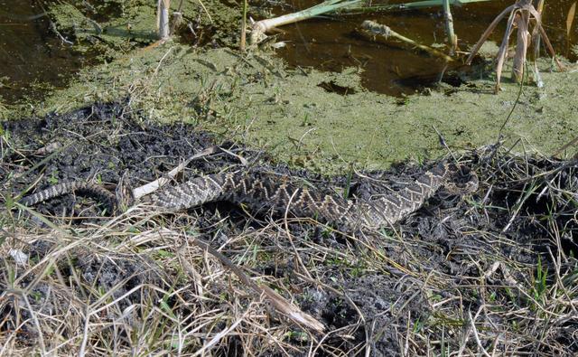 CAPE CANAVERAL, Fla. – An eastern diamondback rattlesnake returns to its natural environs farther from the NASA News Center at NASA's Kennedy Space Center in Florida. The diamondback is Florida's largest venomous snake and may exceed six feet in length. It occurs throughout Florida in a variety of dry habitats, such as pinelands, scrub and golf courses. Kennedy shares a boundary with the Merritt Island Wildlife Nature Refuge, which is a habitat for more than 310 species of birds, 25 mammals, 117 fishes and 65 amphibians and reptiles. Photo credit: NASA/Jack Pfaller