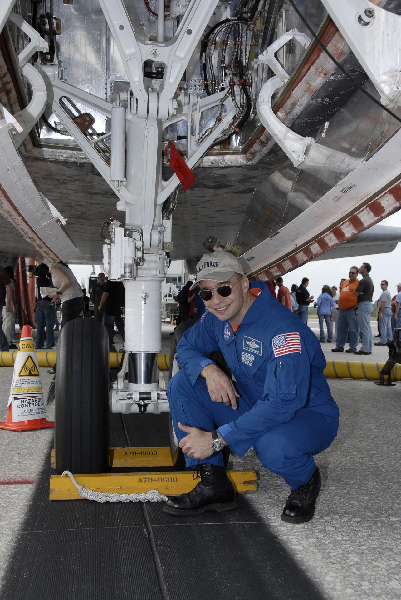 CAPE CANAVERAL, Fla. – STS-119 Commander Lee Archambault kneels beside the nose gear of space shuttle Discovery on Runway 15 at NASA's Kennedy Space Center in Florida. Discovery’s landing completed the 13-day, 5.3-million mile journey of the STS-119 mission to the International Space Station. Main gear touchdown was at 3:13:17 p.m. EDT. Nose gear touchdown was at 3:13:40 p.m. and wheels stop was at 3:14:45 p.m. Discovery delivered the final pair of large power-generating solar array wings and the S6 truss segment. The mission was the 28th flight to the station, the 36th flight of Discovery and the 125th in the Space Shuttle Program, as well as the 70th landing at Kennedy. Photo credit: NASA/Kim Shiflett