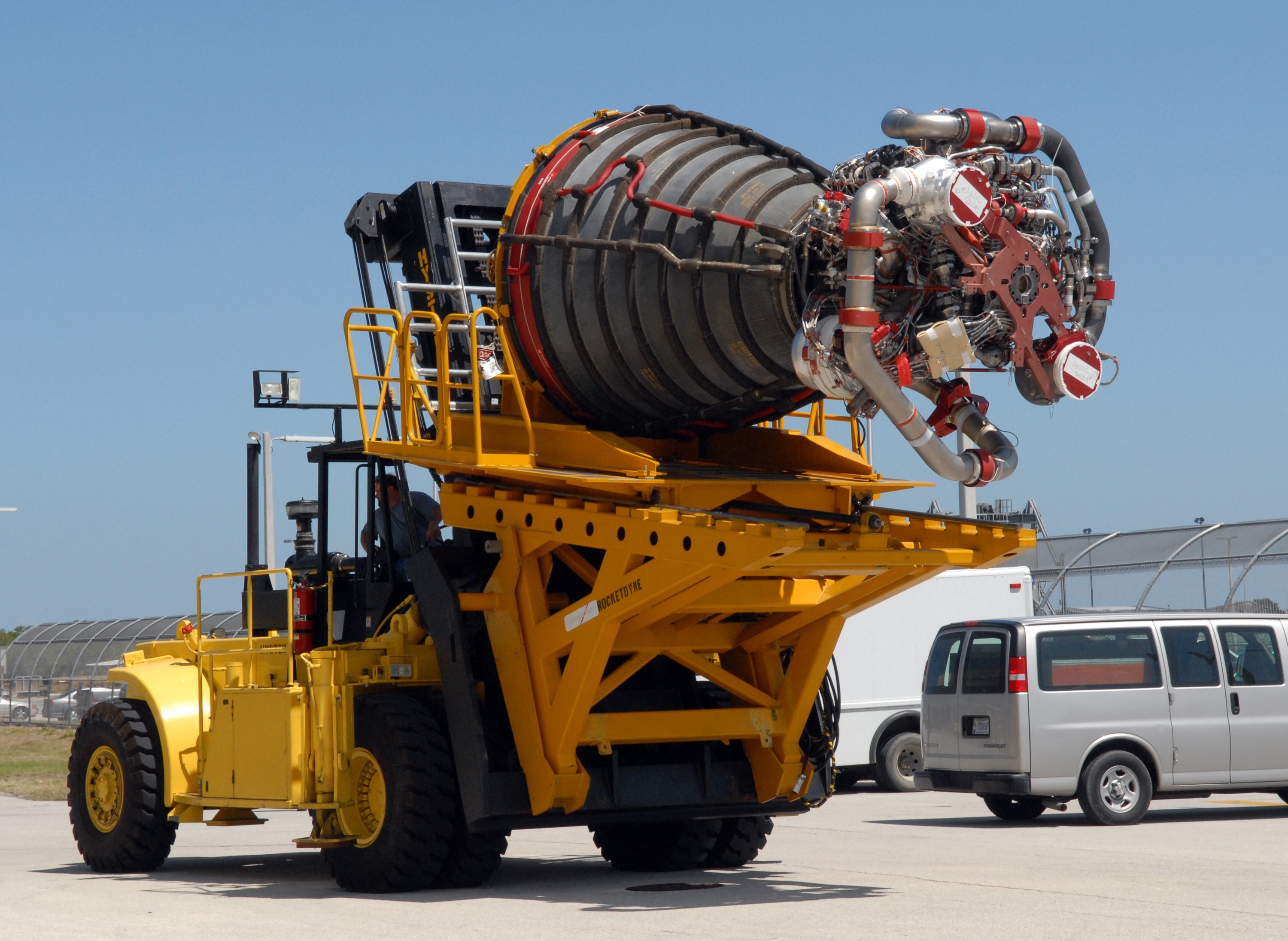 CAPE CANAVERAL, Fla. – After removal from space shuttle Discovery, the third and final main engine, carried by the Hyster forklift, has left Orbiter Processing Facility 3 at NASA's Kennedy Space Center in Florida. Each engine is 14 feet long, weighs about 6,700 pounds, and is 7.5 feet in diameter at the end of the nozzle. Discovery next will be used on the STS-128 mission to deliver supplies and equipment to the International Space Station. The launch is targeted for Aug. 6. Photo credit: NASA/Tim Jacobs