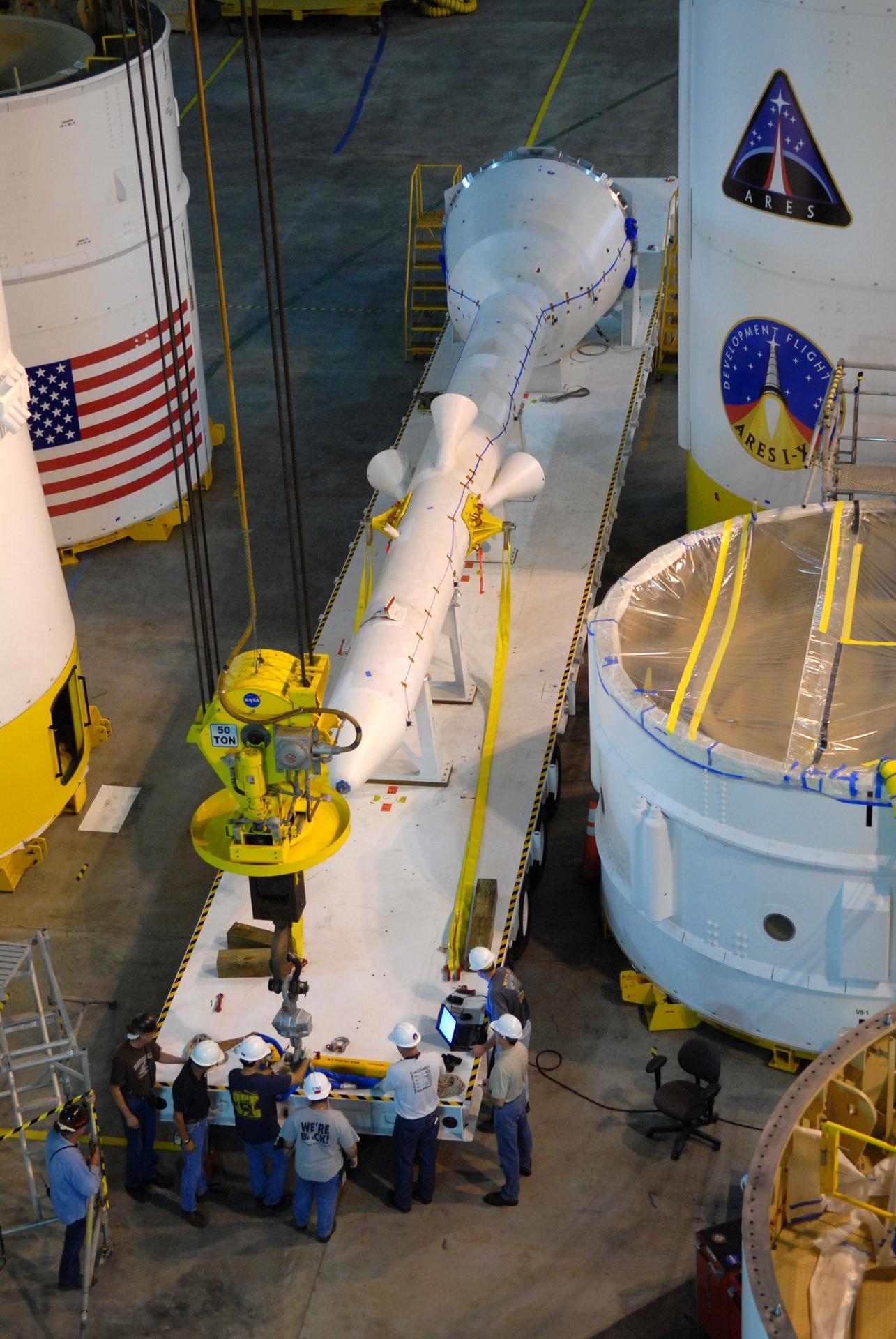 CAPE CANAVERAL, Fla. – In high bay 4 of the Vehicle Assembly Building at NASA's Kennedy Space Center in Florida, workers prepare the crane that will lift and rotate the Ares I-X simulated launch abort system (center) for assembly with the crew module simulator. Ares I-X is the flight test vehicle for the Ares I, which is part of the Constellation Program to return men to the moon and beyond. Ares I is the essential core of a safe, reliable, cost-effective space transportation system that eventually will carry crewed missions back to the moon, on to Mars and out into the solar system. Ares I-X is targeted for launch in July 2009. Photo credit: NASA/Jack Pfaller