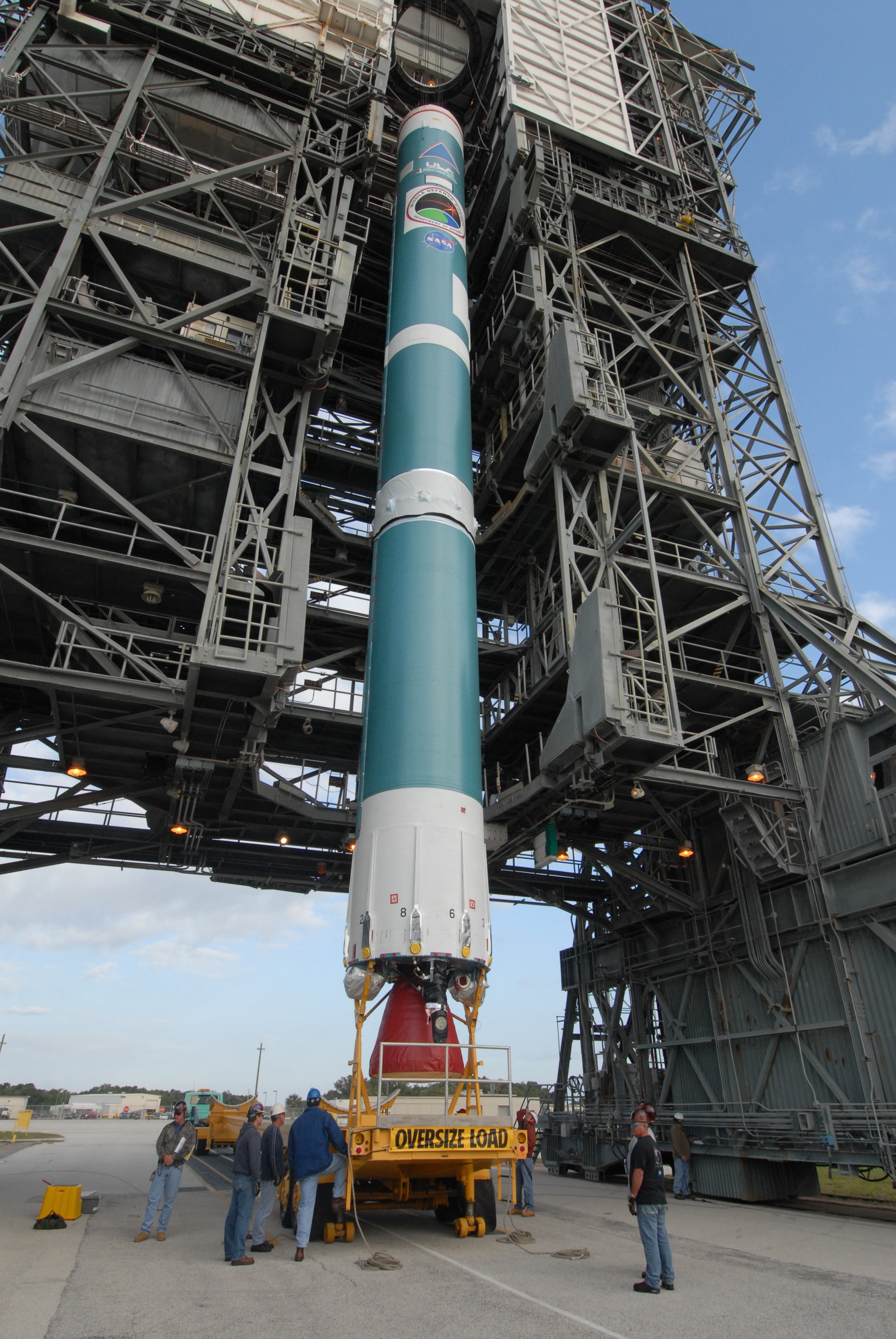 CAPE CANAVERAL, Fla. – On Cape Canaveral Air Force Station's Launch Complex 17-B in Florida, after being raised to vertical, the first stage of a Delta II rocket will be lifted into the mobile service tower on for processing. The rocket is the launch vehicle for the STSS Demonstrators Program. STSS Demonstrators Program is a midcourse tracking technology demonstrator and is part of an evolving ballistic missile defense system. STSS is capable of tracking objects after boost phase and provides trajectory information to other sensors. It will be launched by NASA for the Missile Defense Agency on July 29. Photo credit: NASA/Jack Pfaller