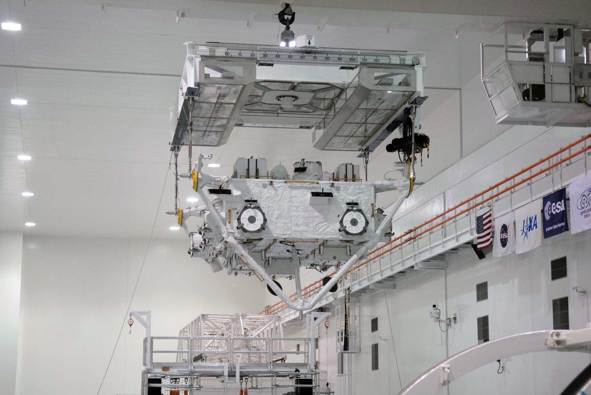 CAPE CANAVERAL, Fla. –– In the Space Station Processing Facility at NASA's Kennedy Space Center in Florida, the Japan Aerospace Exploration Agency's Kibo Exposed Facility, or EF, is moved across the room to transfer it to a workstand. When it is installed on the Kibo laboratory, the EF will provide a multipurpose platform where science experiments can be deployed and operated in the exposed environment. The payloads attached to the EF can be exchanged or retrieved by Kibo's robotic arm, the JEM Remote Manipulator System. The EF, along with the Experiment Logistics Module Exposed Section, will be carried aboard space shuttle Endeavour on the STS-127 mission targeted for launch June 13, 2009. Photo credit: NASA/Kim Shiflett