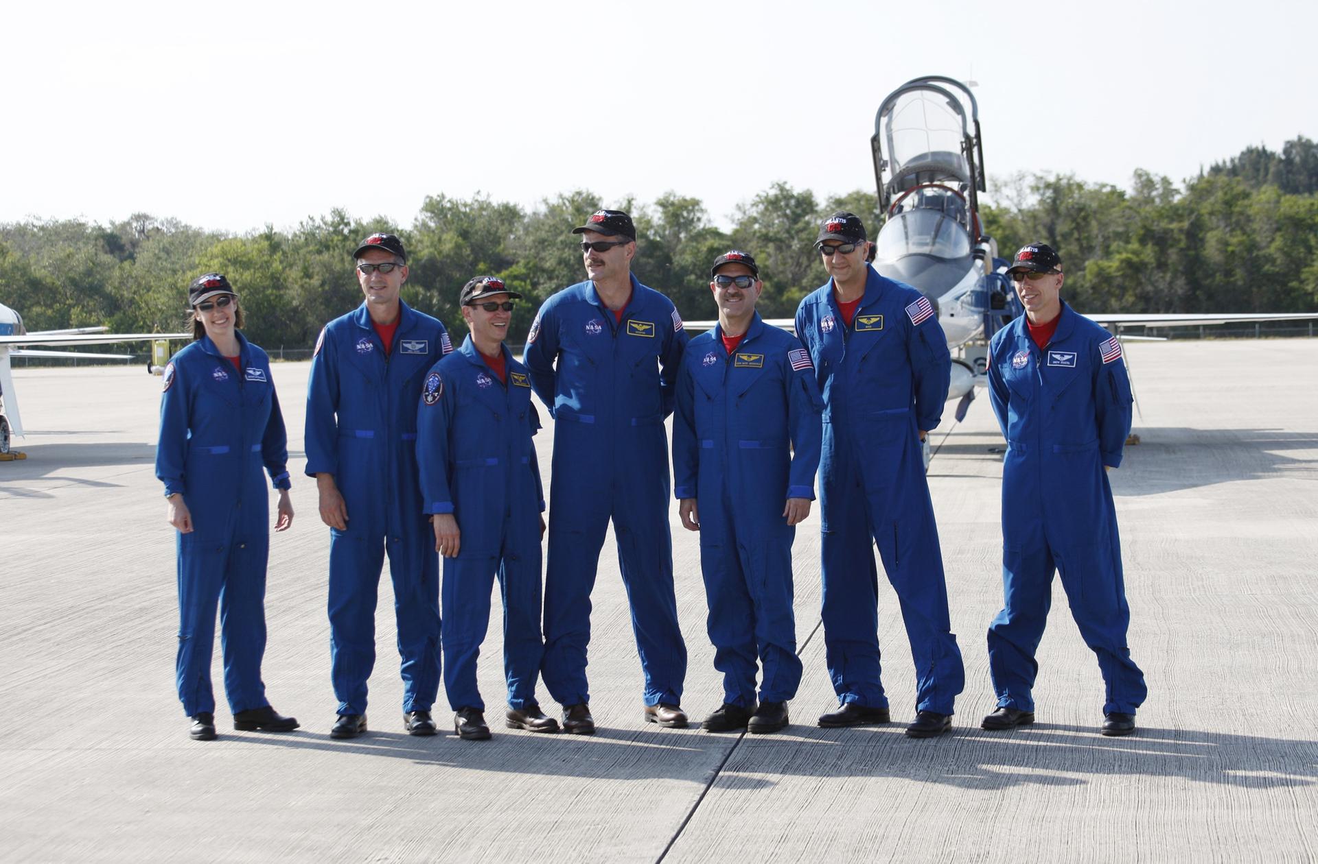 CAPE CANAVERAL, Fla. – At the Shuttle Landing Facility at NASA's Kennedy Space Center in Florida, the STS-125 crew poses for a group portrait. The crew arrived aboard T-38 training jets to get ready for launch aboard space shuttle Atlantis on May 11. From left are Mission Specialists Megan McArthur and Michael Good, Pilot Gregory C. Johnson, Commander Scott Altman, and Mission Specialists John Grunsfeld, Mike Massimino and Andrew Feustel. Atlantis' crew will service NASA's Hubble Space Telescope for the fifth and final time. The flight will include five spacewalks during which astronauts will refurbish and upgrade the telescope with state-of-the-art science instruments. As a result, Hubble's capabilities will be expanded and its operational lifespan extended through at least 2014. Photo credit: NASA/Jim Grossmann
