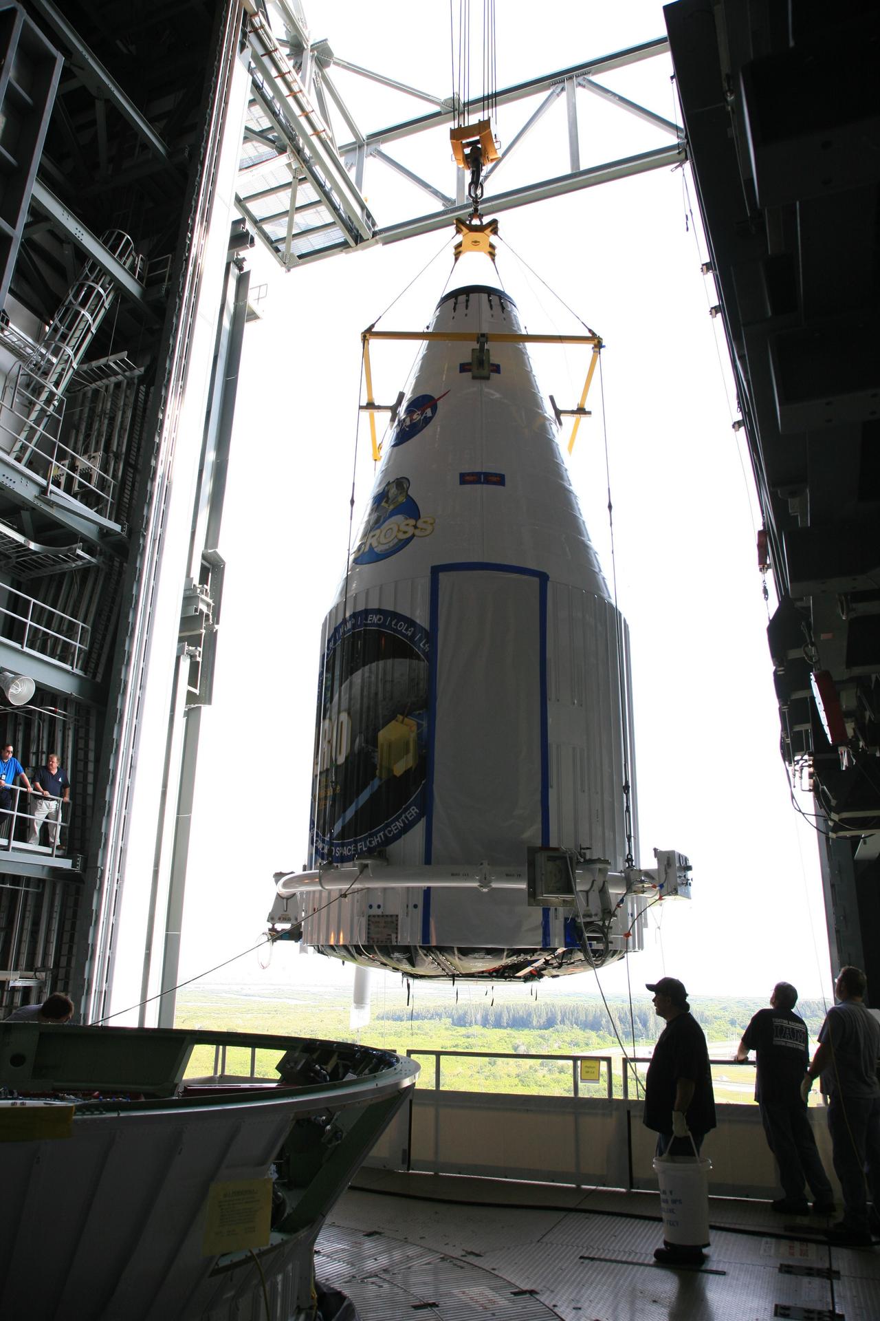 CAPE CANAVERAL, Fla. – On Launch Complex 41 at Cape Canaveral Air Force Station in Florida, the Lunar Reconnaissance Orbiter, or LRO, and NASA's Lunar Crater Observation and Sensing Satellite, known as LCROSS, are moved into the mobile service tower. The LRO will be mated to the Atlas V rocket for launch. The LRO includes five instruments that will help NASA characterize the moon's surface: DIVINER, LAMP, LEND, LOLA and LROC. Along with LCROSS, they will be launched aboard an Atlas V/Centaur rocket on June 17. Photo credit: NASA/Dimitri Gerondidakis