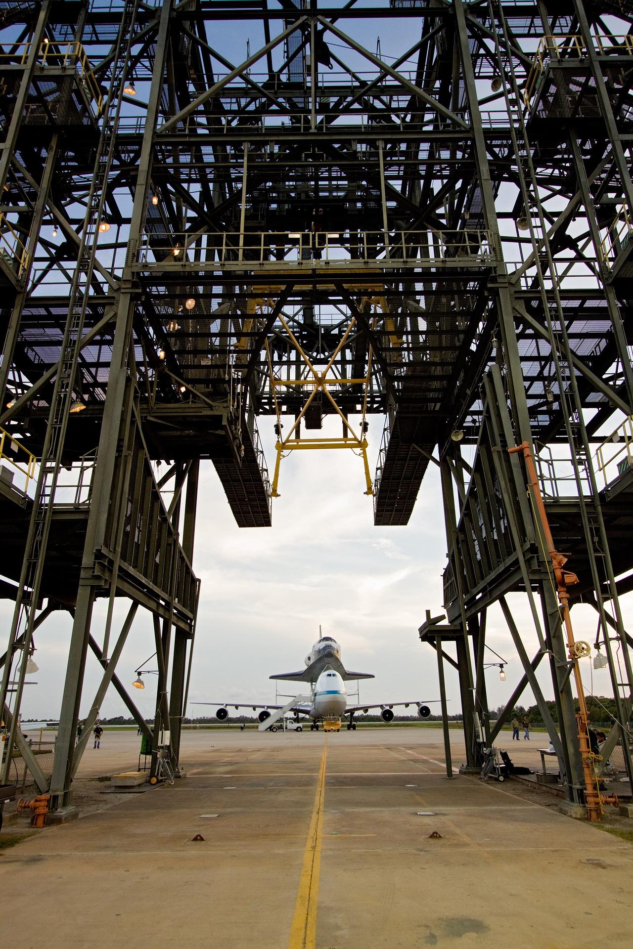CAPE CANAVERAL, Fla. – Space shuttle Atlantis, atop a Shuttle Carrier Aircraft, or SCA, is towed toward the mate/demate device on the Shuttle Landing Facility at NASA's Kennedy Space Center in Florida. The SCA is a modified Boeing 747 jetliner. Once underneath the device, a hoist will lift Atlantis from the back of the SCA and place it on the ground. Atlantis returned from California atop the SCA after its May 24 landing at Edwards Air Force Base, concluding mission STS-125. The ferry flight from Edwards Air Force Base began June 1. Atlantis' next assignment is the STS-129 mission, targeted to launch in November 2009. Photo credit: NASA/Jack Pfaller