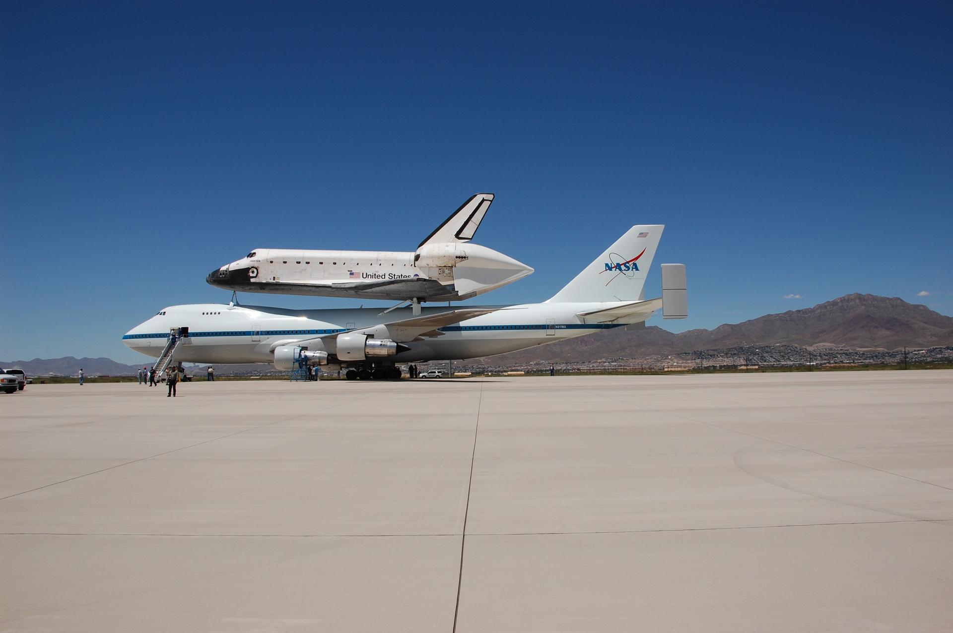 CAPE CANAVERAL, Fla. – Hitching a ride on the Shuttle Carrier Aircraft, or SCA, a modified Boeing 747, space shuttle Atlantis is ready for takeoff from El Paso. Atlantis landed at Edwards Air Force Base in California on May 24, which concluded mission STS-125, after two landing opportunities at Kennedy were waved off due to weather concerns. Atlantis is being returned to Florida on a ferry flight on the SCA. Atlantis' next assignment is the STS-129 mission, targeted to launch in November 2009. Photo credit: NASA/Ben Smegelsky
