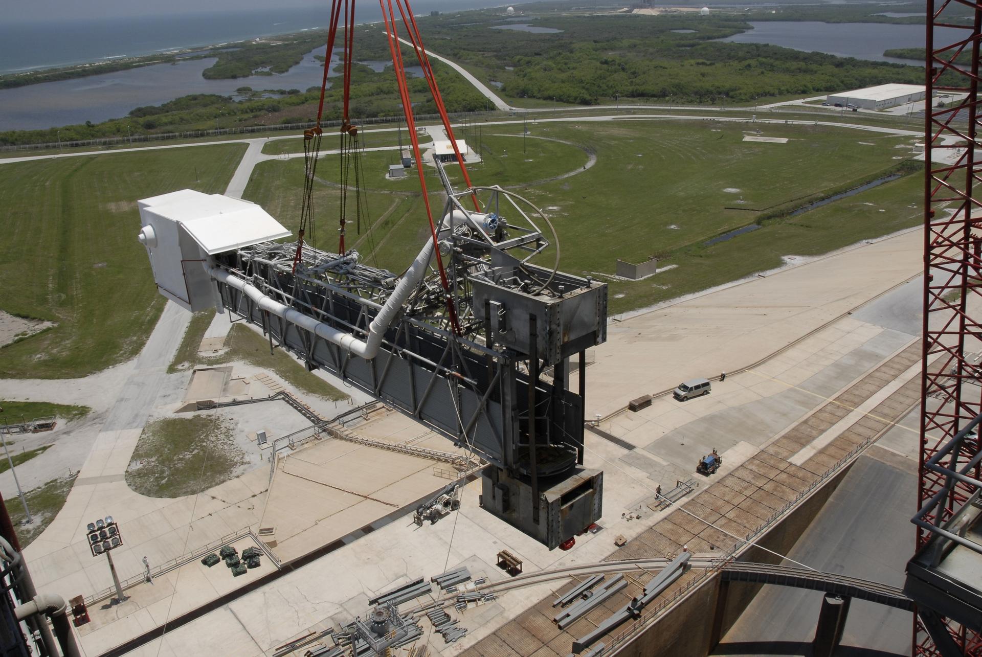 CAPE CANAVERAL, Fla. – The slings from a large crane swing the detached orbiter access arm, which ends in the White Room, away from the fixed service structure, or FSS, on Launch Pad 39B at NASA's Kennedy Space Center in Florida. The White Room provided entry into space shuttles that were on the pad. The arm is being removed from the FSS for the pad's conversion as launch site for the Constellation Program's Ares I-X. The launch of the Ares I-X flight test is targeted for August 2009. Photo credit: NASA/Kim Shiflett