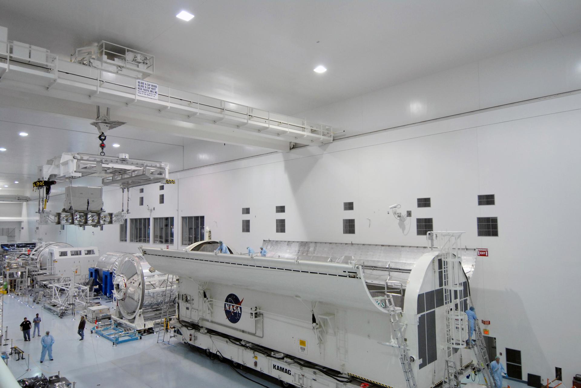 CAPE CANAVERAL, Fla. – In the Space Station Processing Facility at NASA's Kennedy Space Center in Florida, the Lightweight Multi-Purpose Experiment Support Structure Carrier, or LMC, is being moved to the payload canister for installation. Part of the payload for space shuttle Discovery's STS-128 mission to the International Space Station, the carrier holds an ammonia tank assembly. The STS-128 flight also will carry science and storage racks to the space station on Discovery. Launch of Discovery is targeted for Aug. 18. Photo credit: NASA/Tim Jacobs