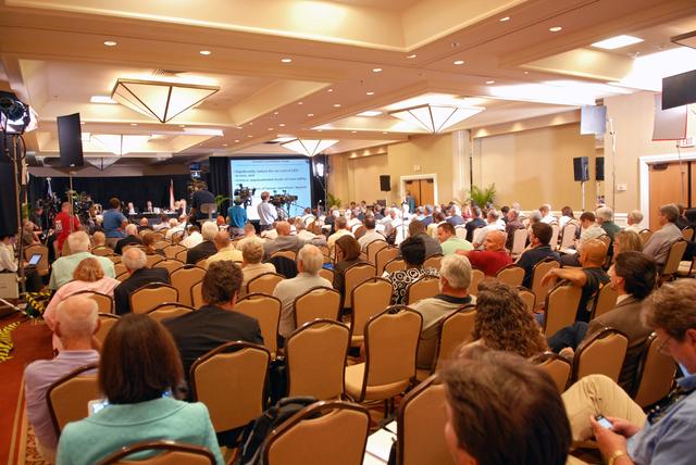 CAPE CANAVERAL, Fla. – Photographers and spectators show their interest in the Augustine Commission, meeting in Cocoa Beach, Fla. At the request of the Office of Science and Technology Policy, NASA established the Review of U.S. Human Space Flight Plans Committee, known as the Augustine Commission. Chaired by Norman R. Augustine, retired chairman and CEO of Lockheed Martin Corp., the committee is conducting an independent review of ongoing U.S. human spaceflight plans and programs, as well as alternatives, to ensure the nation is pursuing the best trajectory for the future of human space flight - one that is safe, innovative, affordable, and sustainable. Photo credit: NASA/Jim Grossmann